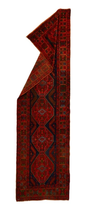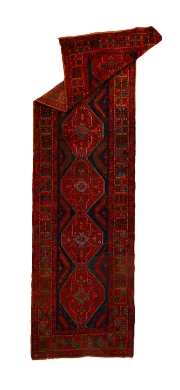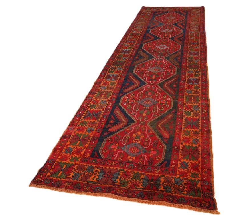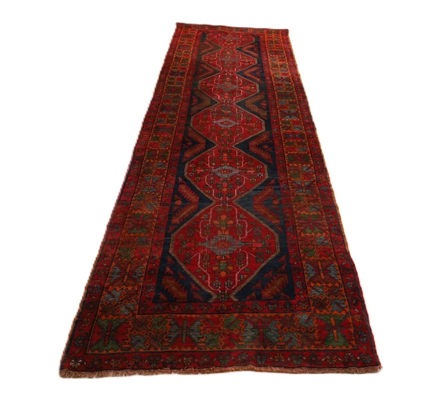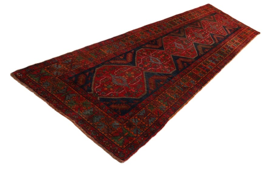 Antiker Meshkien-Läufer | Knotendichte: Handgeknüpft | Material: Wolle und Baumwolle | Größe: 380×106 cm | Farbe: Intensives Rot | Zustand: Antik | Ursprung: Iran/Persien | Gewicht: ca. 12 kg | Dicke: ca. 8 mm | Einzigartige geometrische Muster