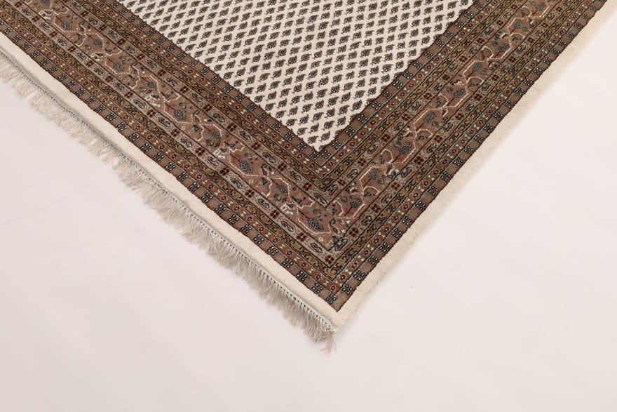 Mir Teppich | Knotendichte: 128.000 – 160.000 Knoten/m² | Material: Handgeknüpfte Wolle | Größe: 207×141 cm | Farbe: Weiß/Beige | Zustand: Neu | Ursprung: Indien | Dicke: ca. 10 mm | Gewicht: ca. 8 kg