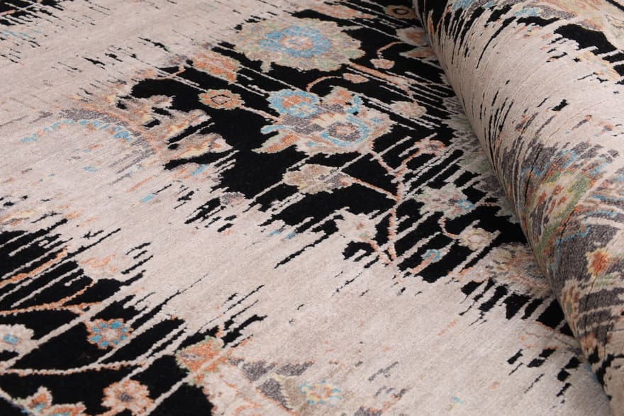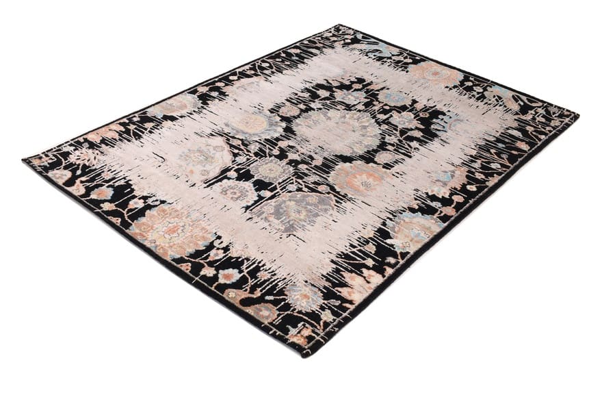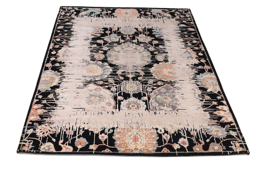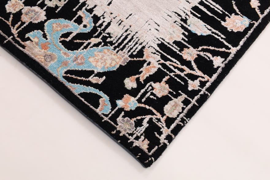 ModernLOTUS Teppich | Knotendichte: 200.000 – 250.000 Knoten/m² | Material: Wolle mit Bamboo Seide und Baumwolle | Größe: 189×124 cm | In neuem Zustand | Ursprung: Indien | Farbe: Schwarz/Grau | Form: Rechteckig | Dicke: ca. 10 mm | Gewicht: ca. 8 kg