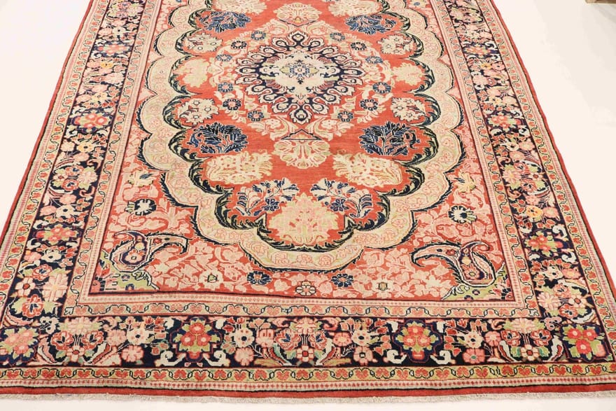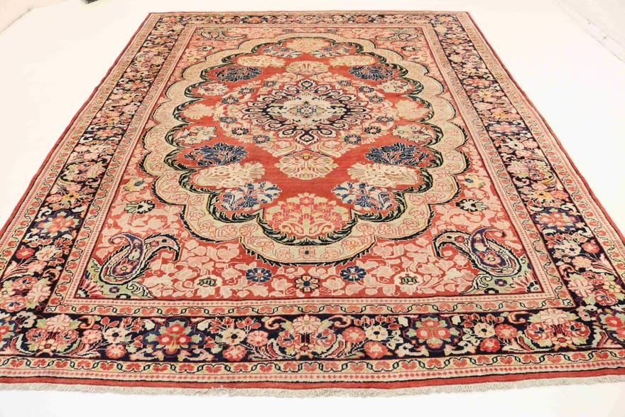 Antiker Mohajeran Teppich | Knotendichte: 320.000 – 360.000 Knoten/m² | Material: Wolle mit Baumwollkette | Größe: 368×282 cm | Farbe: Rot/Orange | Zustand: Antik | Ursprung: Iran/Persien | Dicke: ca. 10 mm | Gewicht: ca. 40 kg | Verarbeitung: Handgeknüpft