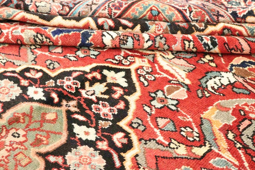 Antiker Mohajeran Teppich | Knotendichte: 160.000 – 200.000 Knoten/m² | Material: Wolle (Flor), Baumwolle (Kette) | Größe: 427×321 cm | Farbe: Rot/Orange | Zustand: Antik | Ursprung: Iran/Persien | Verarbeitung: Handgeknüpft | Dicke: ca. 10 mm | Gewicht: ca. 40 kg