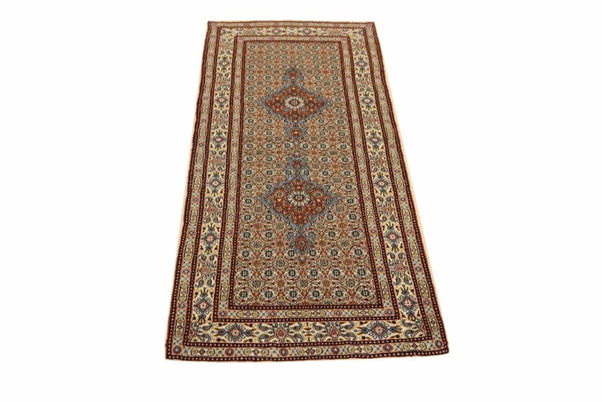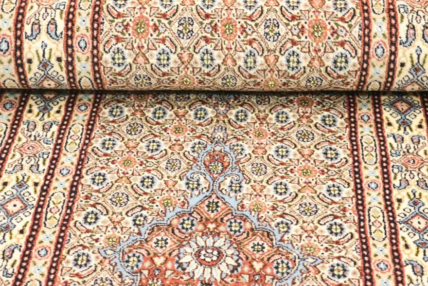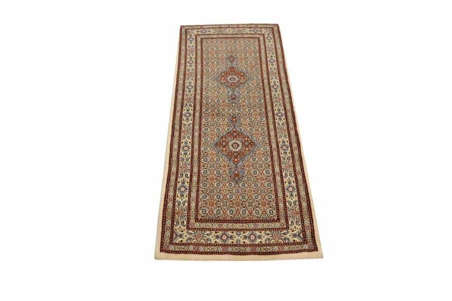 Handgeknüpfter Moud-Teppich | Knotendichte: 200.000 – 250.000 Knoten/m² | Material: Wolle und Baumwolle | Größe: 206×80 cm | Farbe: Weiß/Beige | Muster: Medaillon- und Herati-Muster | Zustand: Neu | Herkunft: Iran/Persien | Dicke: ca. 10 mm | Gewicht: ca. 5 kg