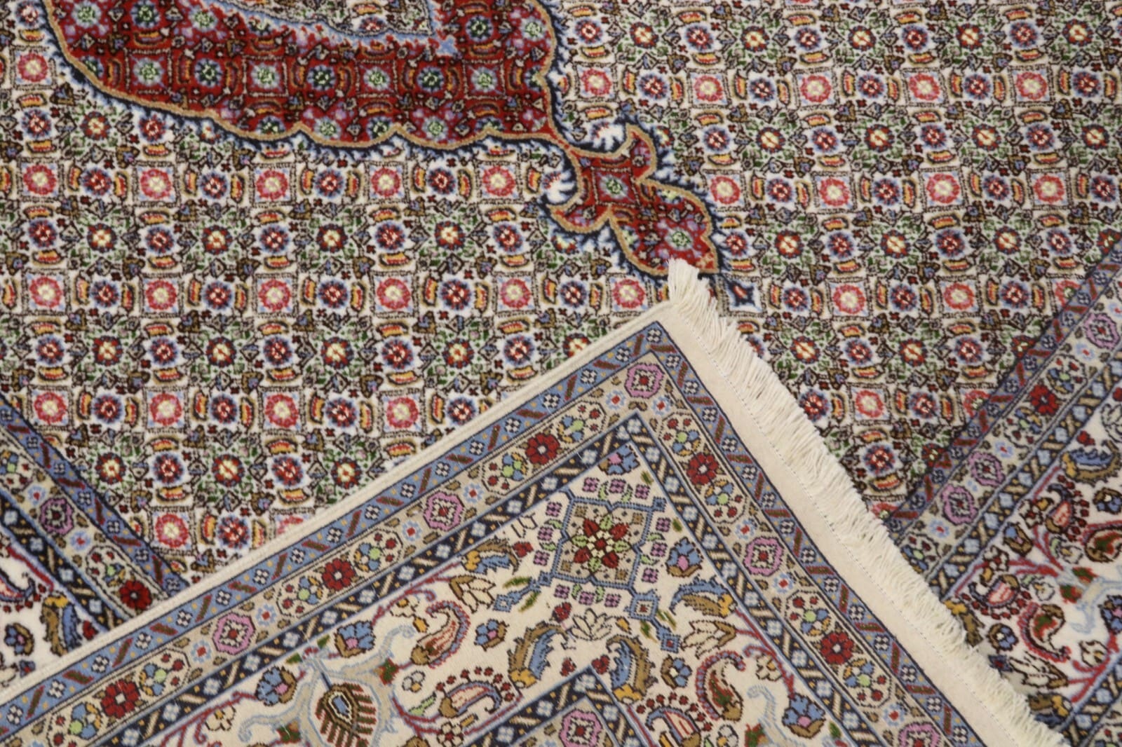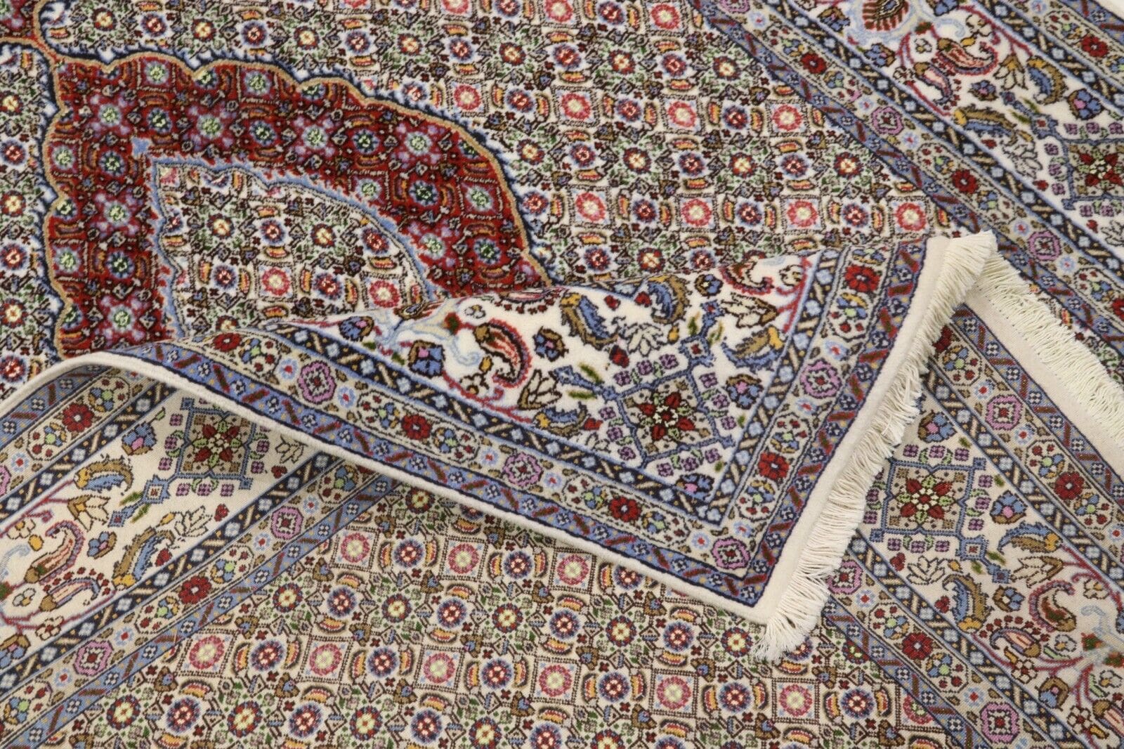 Echte handgeknüpfte Teppiche, wie der Orientteppich Moud, sind an der Knotendichte, der Rückseite, die das gleiche Muster aufweist wie die Vorderseite, und der Verarbeitung von hochwertigen Materialien zu erkennen. Ein Unterschied in der Musterung auf der Rückseite oder minderwertige Materialien deuten auf einen maschinell hergestellten Teppich hin.