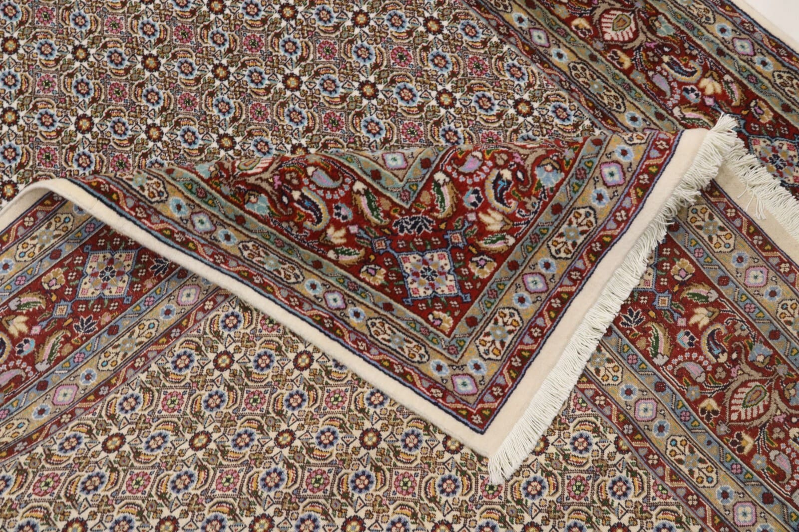 Handgeknüpfter Orientteppich Moud | Knotendichte: ca. 400.000 Knoten/m² | Material: 90% Schurwolle, 10% Seide | Größe: 248 x 170 cm | Zustand: Neu, sehr gut | Herkunft: Persien, Nordost-Persien | Besonderheiten: Für Fußbodenheizung geeignet, haustierfreundlich | Muster: Orientalisch, traditioneller Stil | Gewicht: 10 kg | Florhöhe: 8 mm