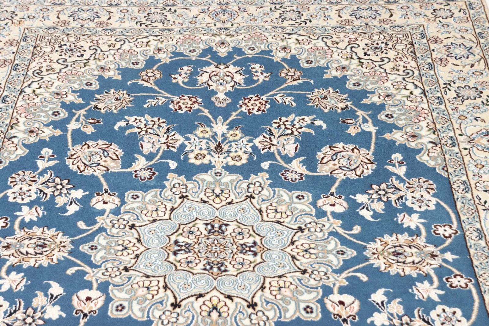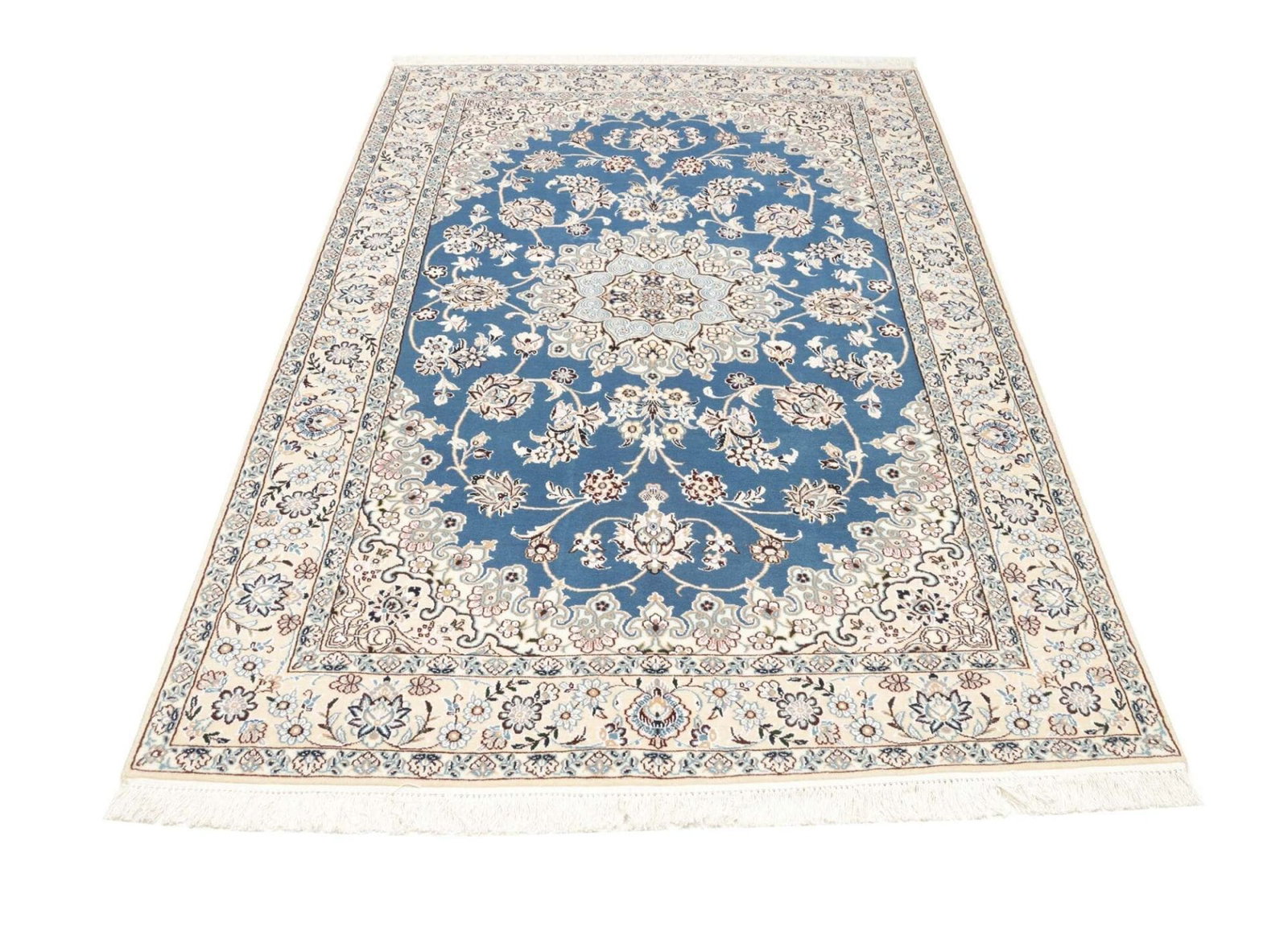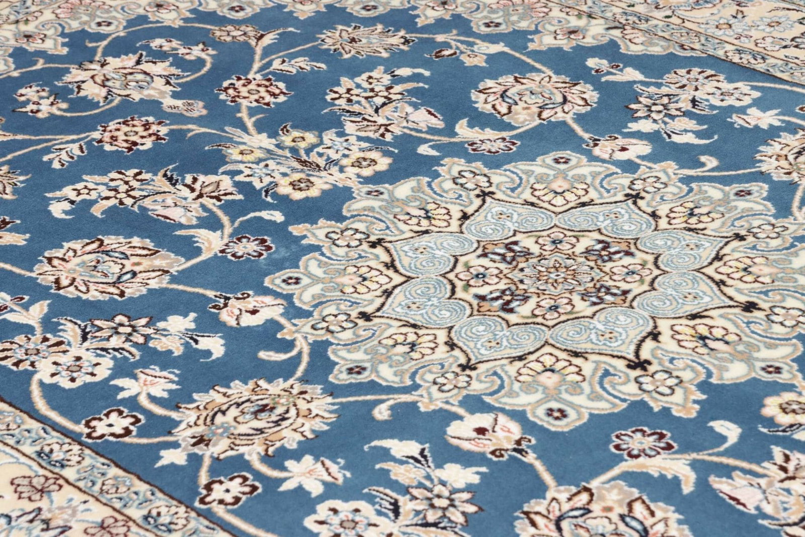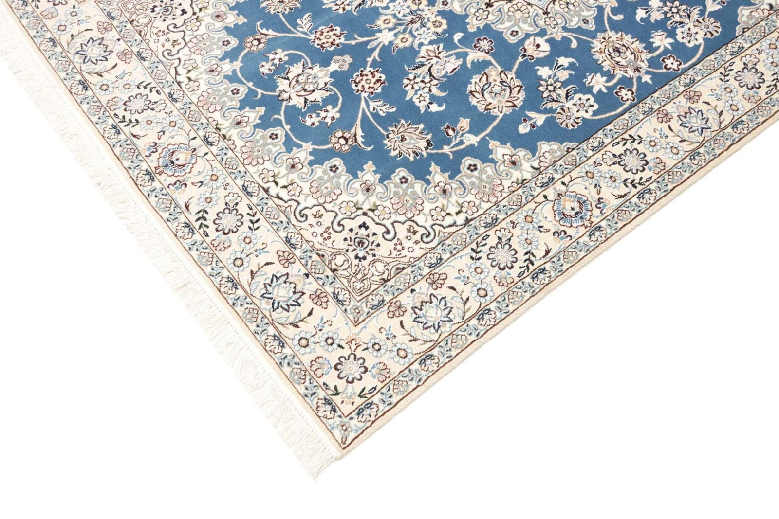 Handgeknüpfter Nain Teppich | Knotendichte: ca. 500.000 Knoten/m² | Material: 100% Schurwolle (Flor), 100% Baumwolle (Kette) | Größe: 140 x 214 cm | Höhe: ca. 10-12 mm | Herkunft: Iran | Exquisites florales Muster in königsblauen und hellen Tönen | Ideal für eine gemütliche und stilvolle Einrichtung