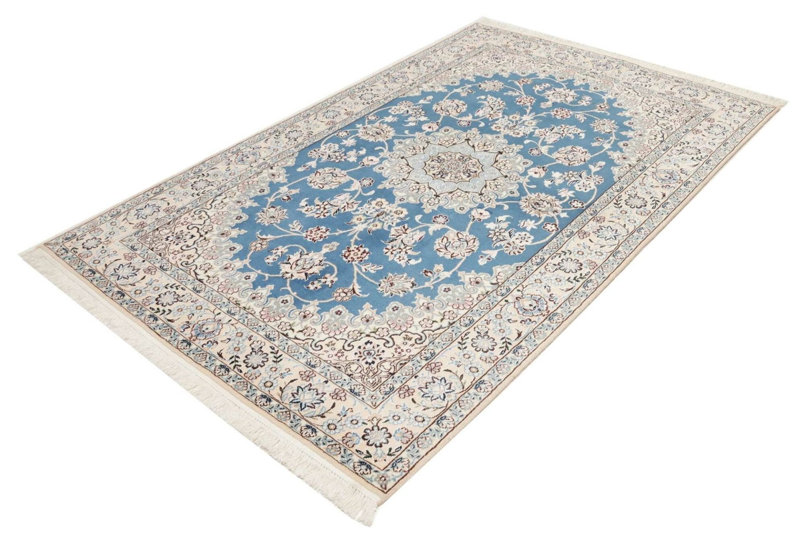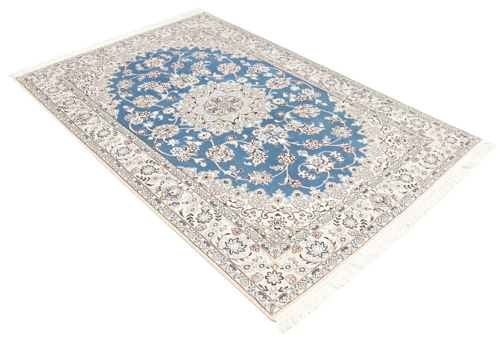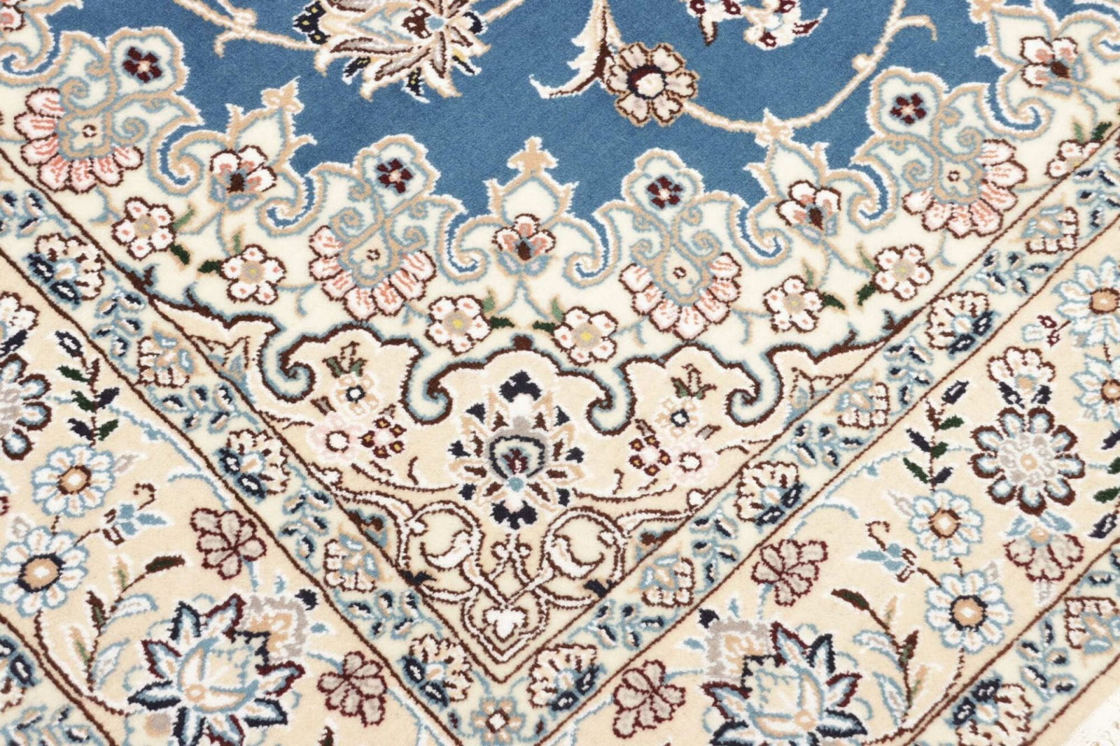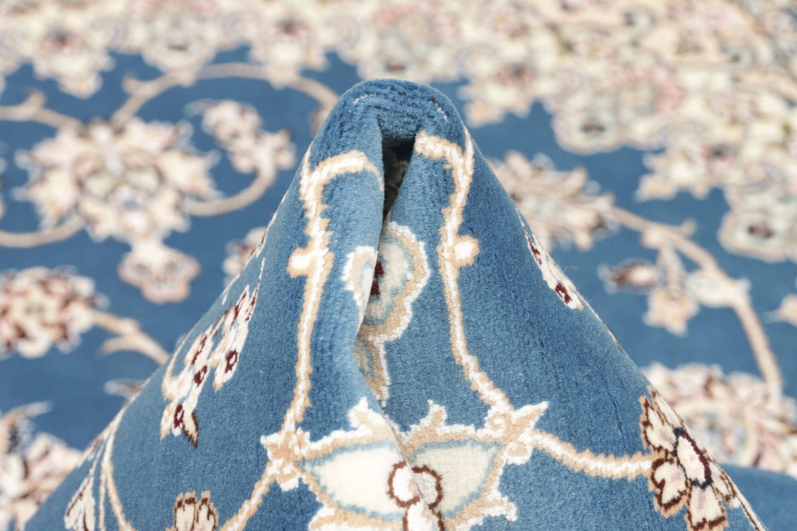 Handgeknüpfter Nain Teppich | Knotendichte: ca. 500.000 Knoten/m² | Material: 100% Schurwolle (Flor), 100% Baumwolle (Kette) | Größe: 140 x 214 cm | Höhe: ca. 10-12 mm | Herkunft: Iran | Exquisites florales Muster in königsblauen und hellen Tönen | Ideal für eine gemütliche und stilvolle Einrichtung