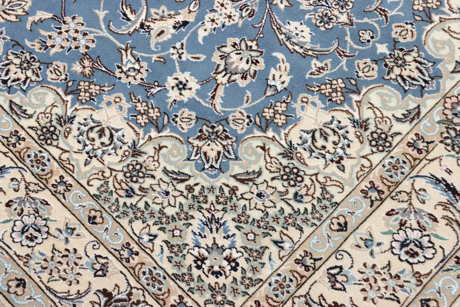 Der Nain-Teppich stammt aus der gleichnamigen Stadt in der Provinz Isfahan, Iran. Diese Region ist weithin bekannt für ihre jahrhundertealte Teppichtradition und hat sich einen Namen für die Herstellung einiger der schönsten und hochwertigsten Teppiche gemacht. Nain-Teppiche sind oft mit feinen, detailreichen Mustern verziert, und die Kunst des Teppichknüpfens ist tief in der Kultur und Geschichte der Region verwurzelt. Die Stadt Nain selbst hat eine lange Geschichte, die bis in die Zeit der Sassaniden zurückreicht, und war ein bedeutendes Zentrum für Kunst und Handwerk.