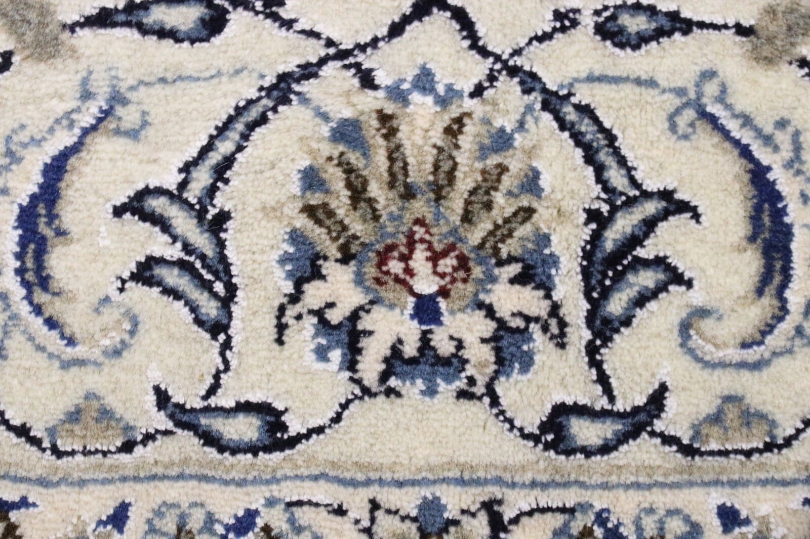 Der Ursprung dieses Teppichs liegt in der Stadt Nain, die sich in der Provinz Isfahan im Iran befindet. Nain ist bekannt für seine exquisiten Teppiche, die oft eine Kombination aus traditioneller Handwerkskunst und eleganten Designs aufweisen. Die Teppichknüpftradition in Nain geht auf das 16. Jahrhundert zurück und steht für Qualität und ansprechende Designs. Nain-Teppiche sind berühmt für ihre sanften Farben, vorwiegend in Blau- und Beigetönen, und oft zieren florale Muster die Teppiche, die die Schönheit der persischen Landschaft widerspiegeln.