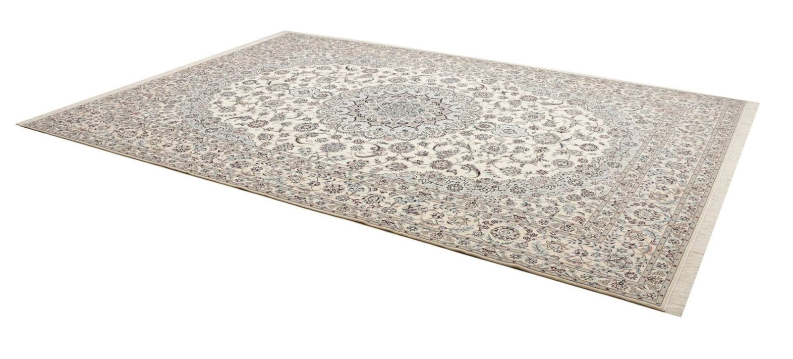 Nain Teppich | Knotendichte: ca. 900.000 Knoten/m² | Material: 100% Schurwolle (Flor), 100% Baumwolle (Kette) | Größe: 259 x 369 cm | Herkunft: Iran | Zustand: Handgeknüpft, in ausgezeichnetem Zustand | Muster: Klassische florale Motive in hellem Grundton mit königsblauen Akzenten