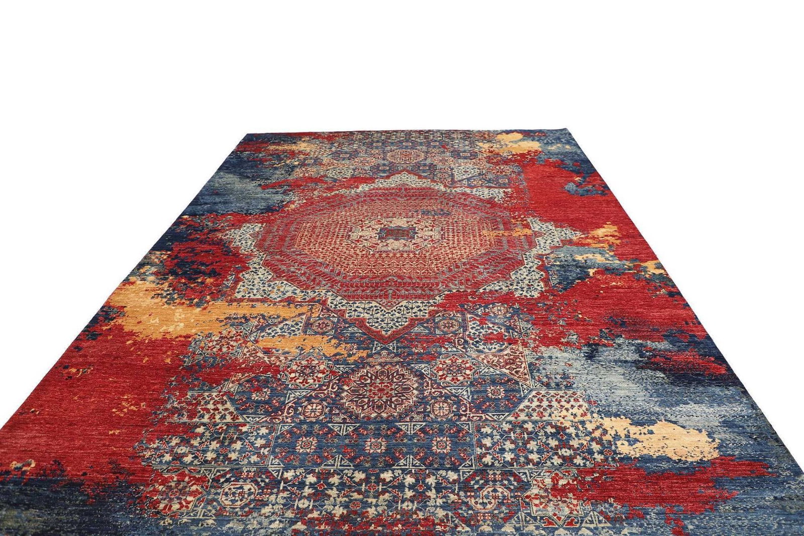 Der Neo Teppich ist handgeknüpft und besteht aus 100% Schurwolle im Flor sowie 100% Baumwolle in der Kette. Die Verarbeitung erfolgt mit einer hohen Knotendichte von circa 200.000 Knoten pro Quadratmeter, was für eine feine und langlebige Struktur sorgt. Die Kombination von Hochlandwolle und Seide verleiht dem Teppich eine besondere Eleganz und Qualität.