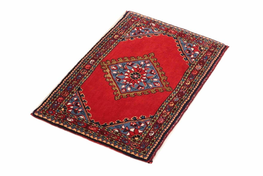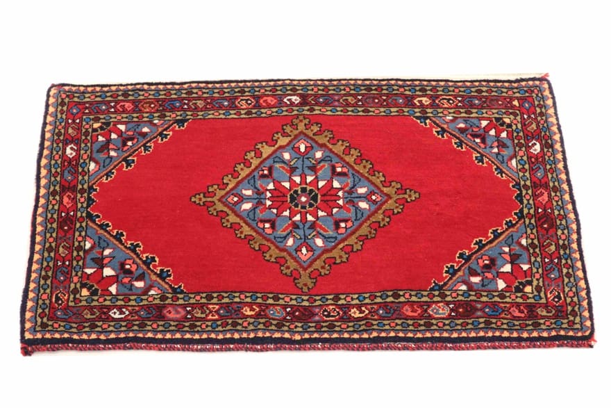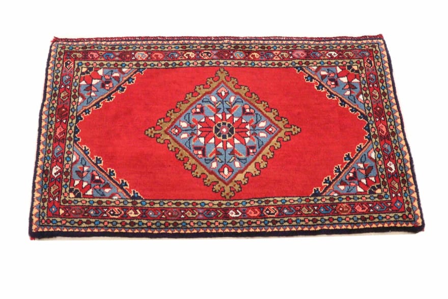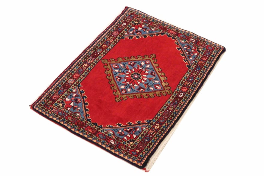 Handgeknüpfter Teppich aus Hamedan | Knotendichte: 200.000 – 250.000 Knoten/m² | Material: Handgesponnene Wolle und Baumwolle | Größe: 62×89 cm | Farbe: Rot/Orange | Zustand: Neu | Herkunft: Iran/Persien | Dicke: ca. 6 mm | Gewicht: ca. 2 kg