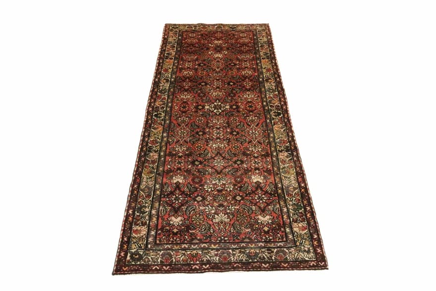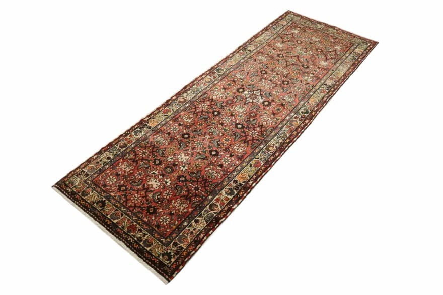 Handgeknüpfter Teppich aus Hamedan | Knotendichte: 200.000 – 250.000 Knoten/m² | Material: Wolle (Flor), Baumwolle (Kette) | Größe: 318×109 cm | Farbe: Rot/Orange | Zustand: Neuzeitlich (0-20 Jahre) | Ursprung: Iran/Persien | Dicke: ca. 8 mm | Gewicht: ca. 8 kg