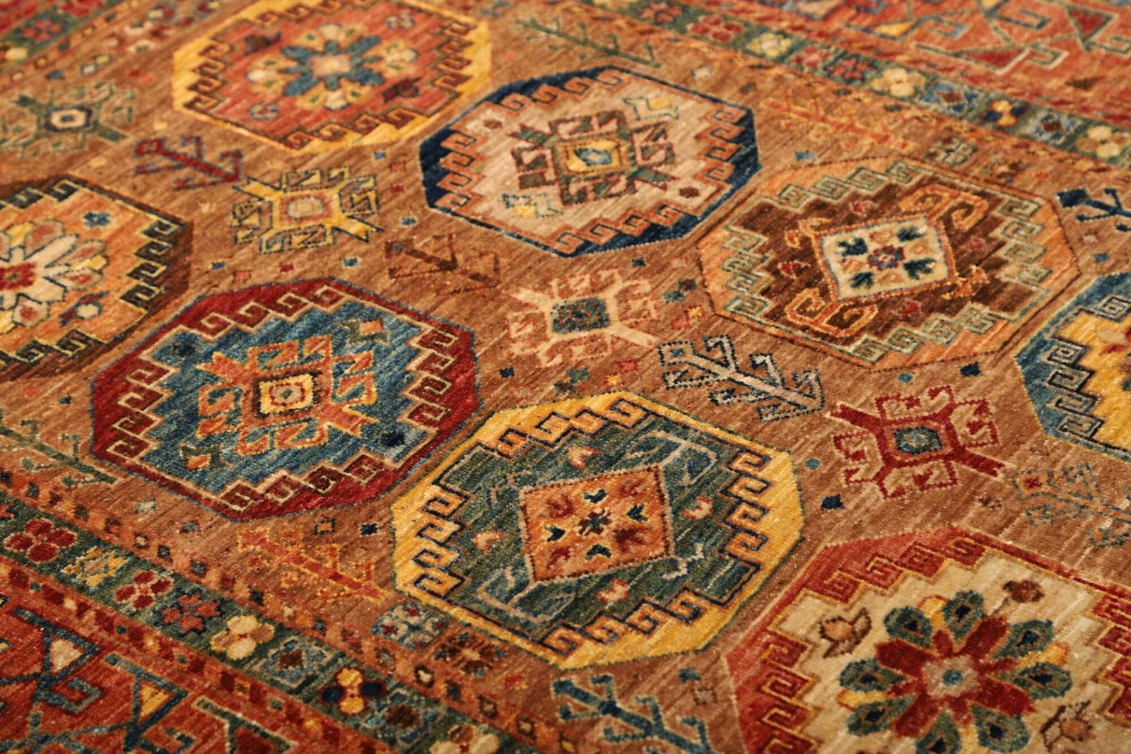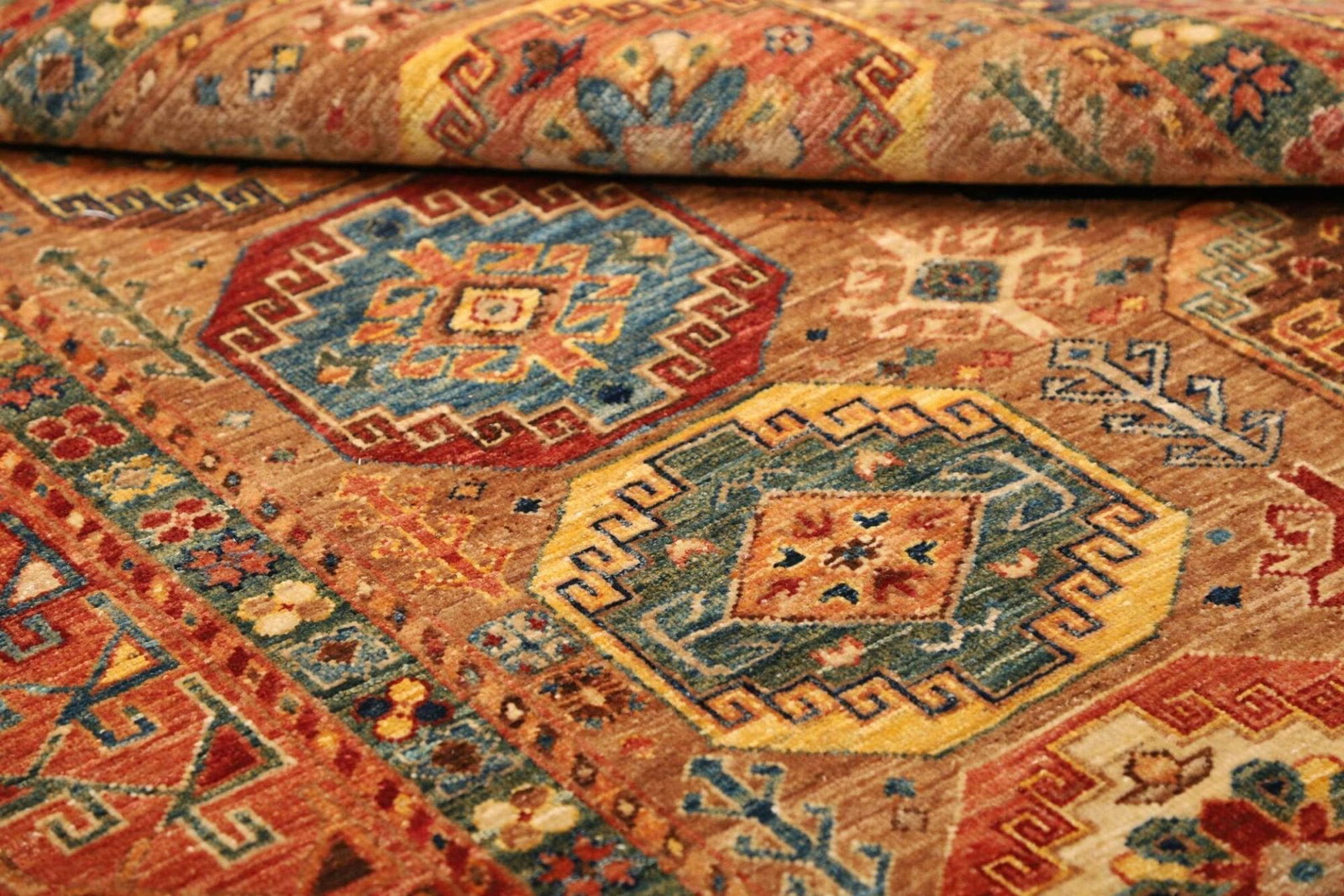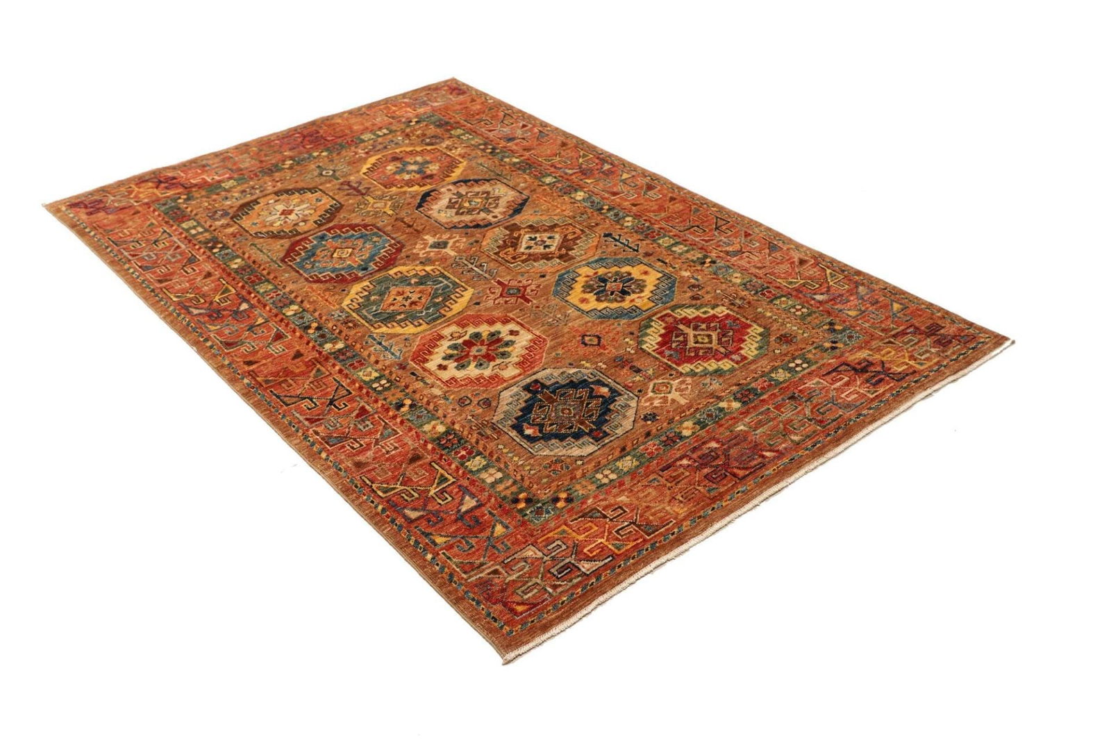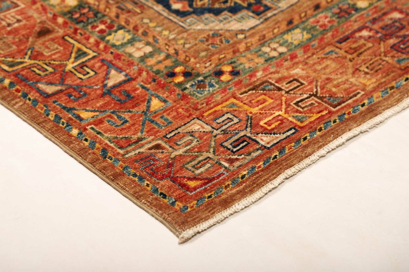 Das Design des Orientteppichs Samarkand ist durch eine lebendige Farbpalette geprägt, die von tiefen Rottönen über leuchtendes Blau bis hin zu sanften Erdtönen reicht. Diese Farben werden aus natürlichen Pflanzenfarbstoffen gewonnen, was nicht nur umweltfreundlich ist, sondern dem Teppich auch einen einzigartigen Charakter verleiht.