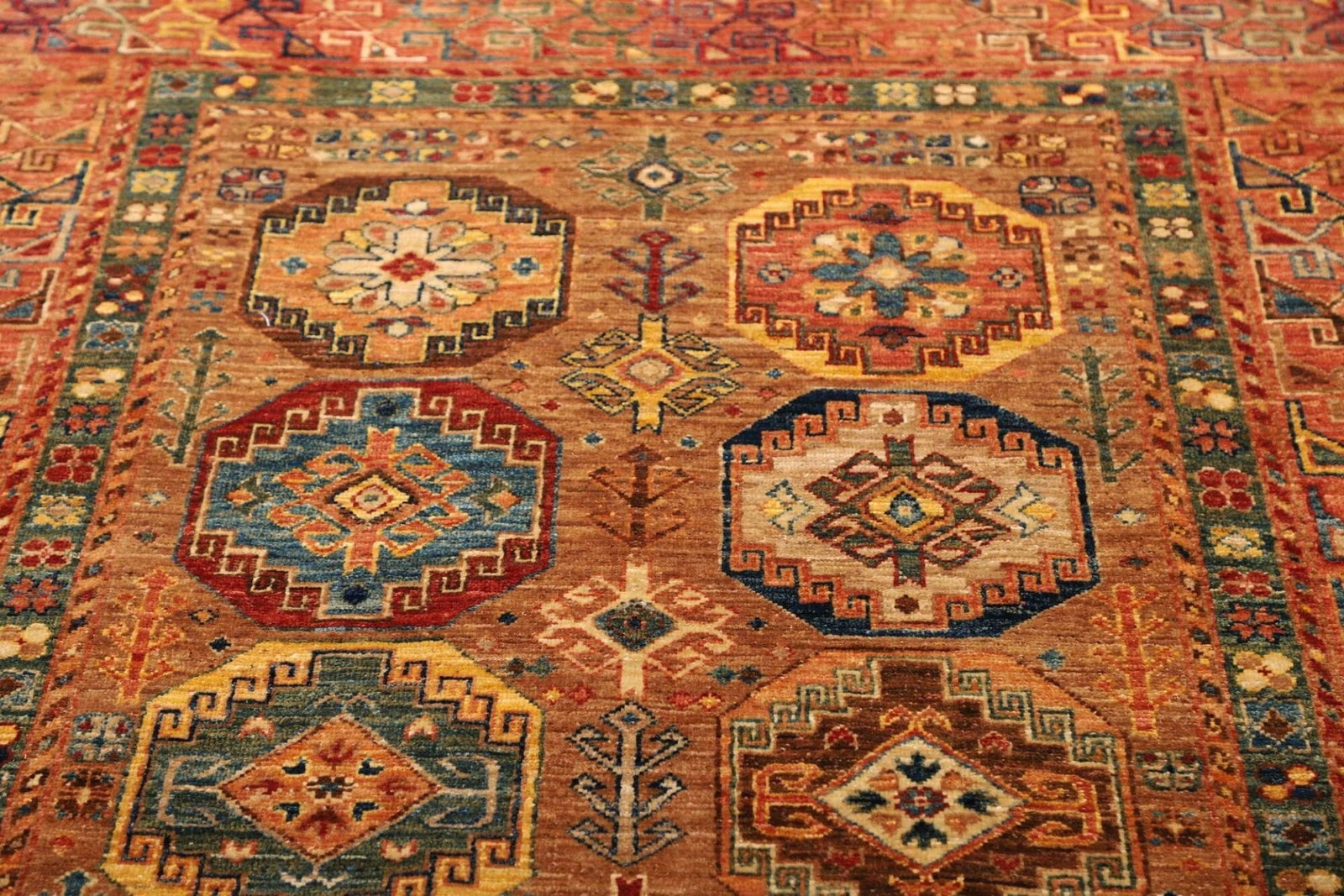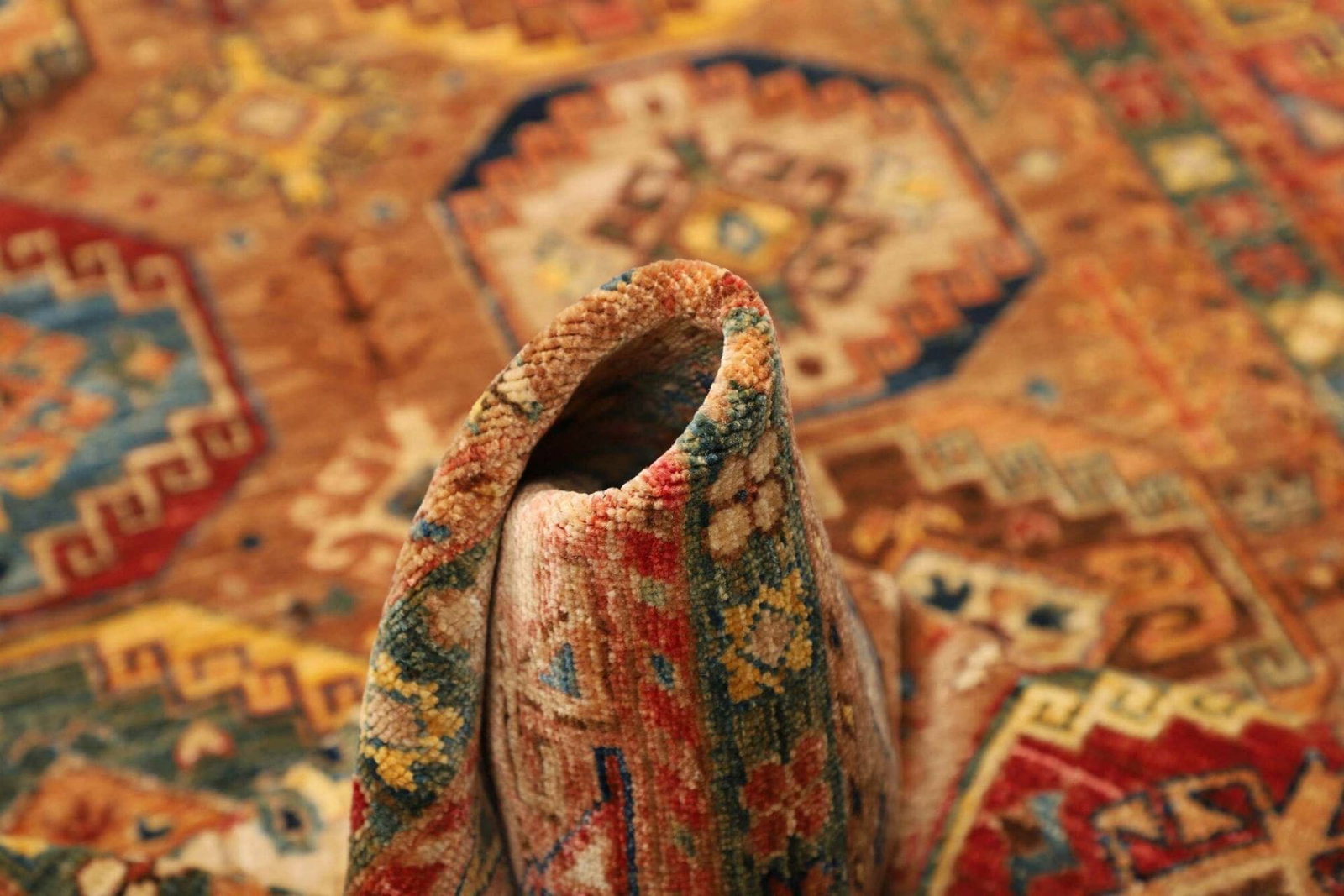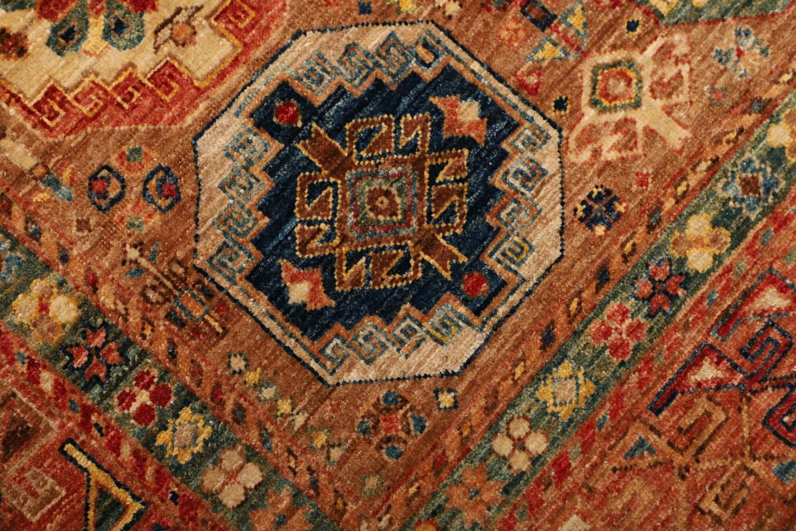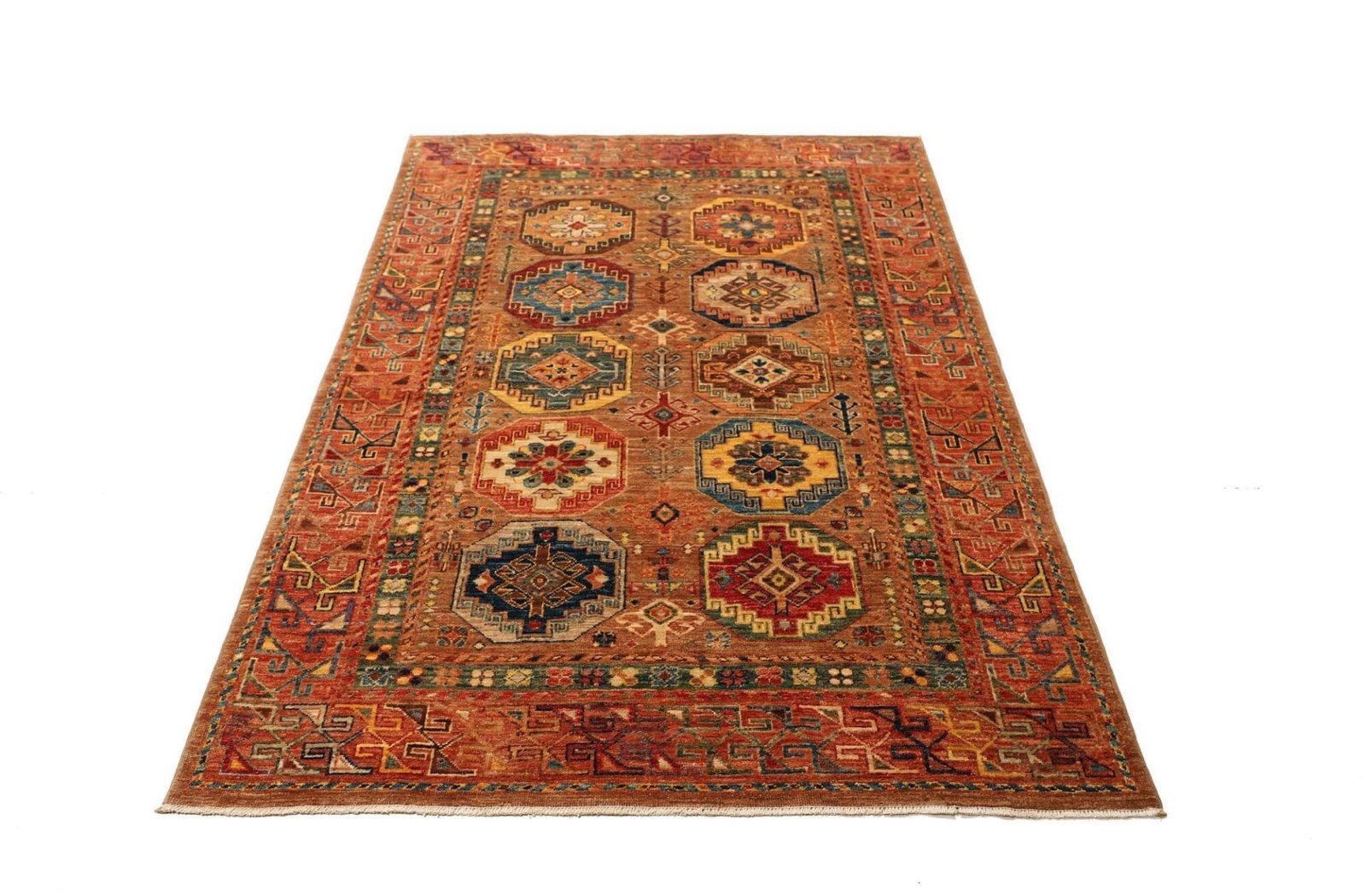 Das Design des Orientteppichs Samarkand ist durch eine lebendige Farbpalette geprägt, die von tiefen Rottönen über leuchtendes Blau bis hin zu sanften Erdtönen reicht. Diese Farben werden aus natürlichen Pflanzenfarbstoffen gewonnen, was nicht nur umweltfreundlich ist, sondern dem Teppich auch einen einzigartigen Charakter verleiht.
