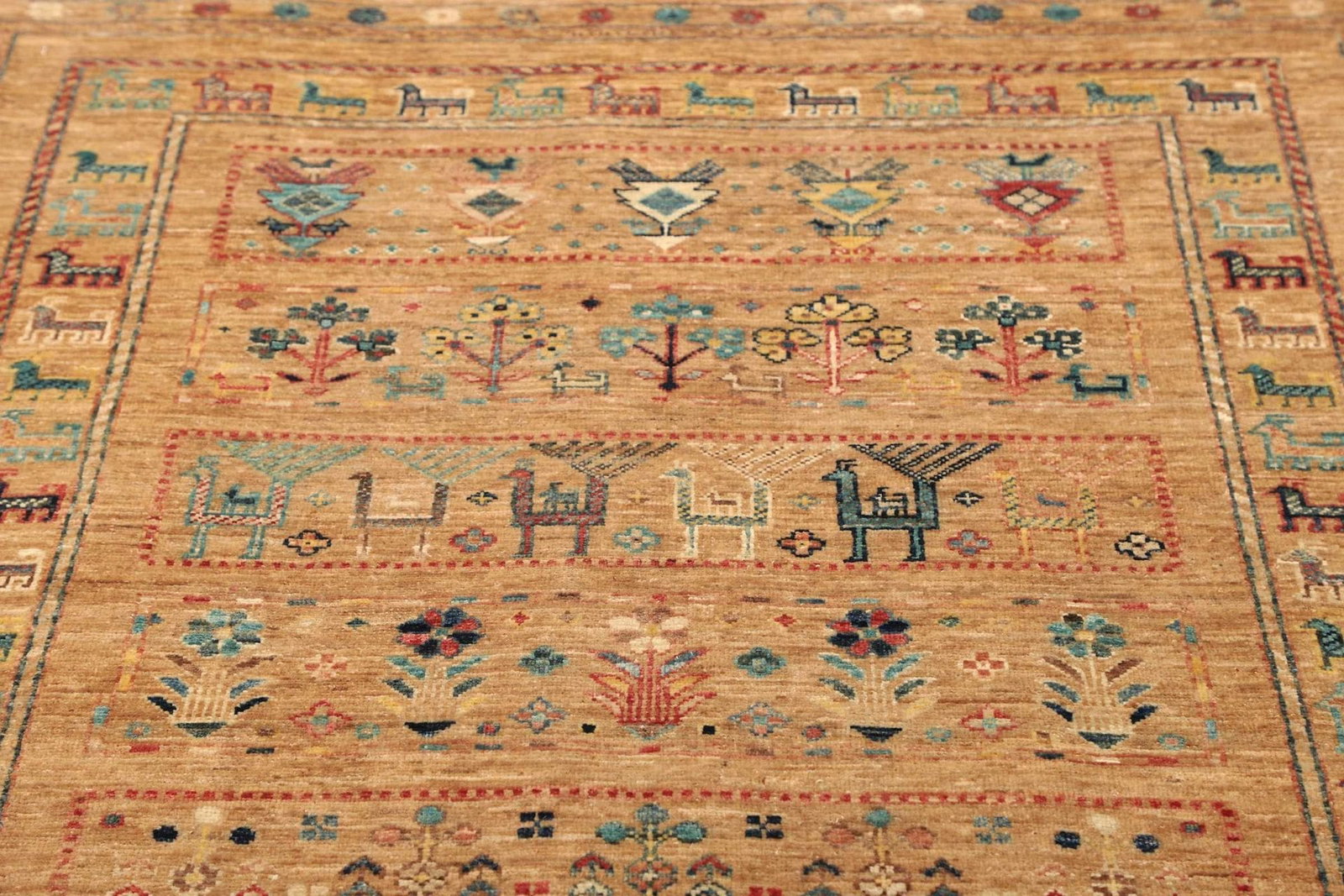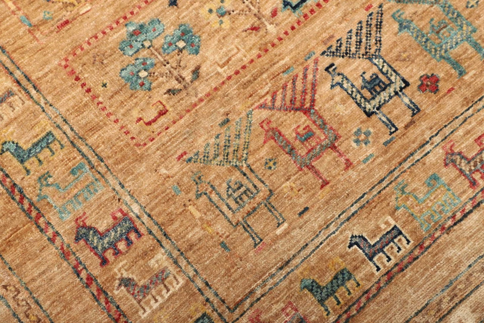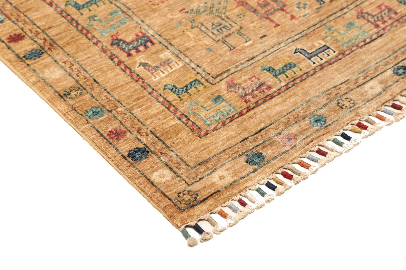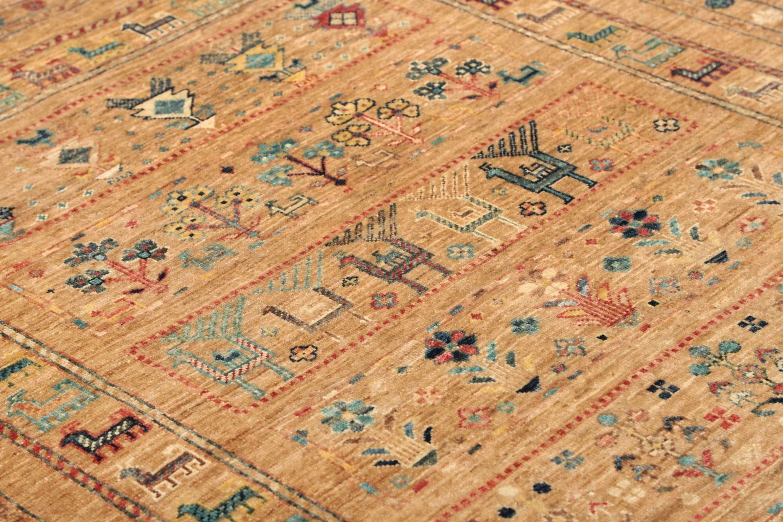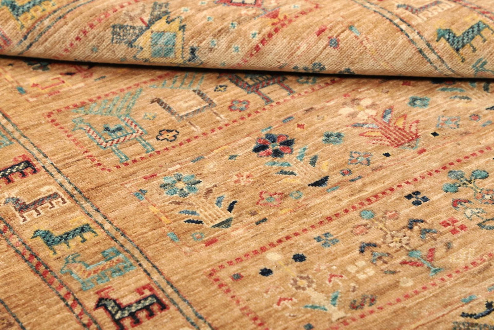 Der Teppich besteht aus reiner Schurwolle, die für ihre Langlebigkeit und Robustheit bekannt ist. Schurwolle hat den Vorteil, dass sie viel Feuchtigkeit aufnehmen kann und dabei trotzdem atmungsaktiv bleibt. Außerdem fühlt sich die Wolle angenehm an und sorgt für eine gemütliche Atmosphäre. Die handgeknüpfte Verarbeitung garantiert, dass jeder Teppich ein Unikat ist und mit viel Liebe zum Detail gefertigt wurde. Diese Technik des Teppichknüpfens ermöglicht eine hohe Knotendichte, die für die Stabilität und die Lebensdauer des Teppichs entscheidend sind. Ein handgeknüpfter Teppich ist eine Investition in Qualität und Stil, die über Jahre hinweg Freude bereitet.