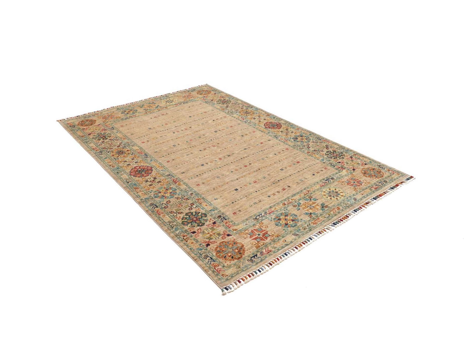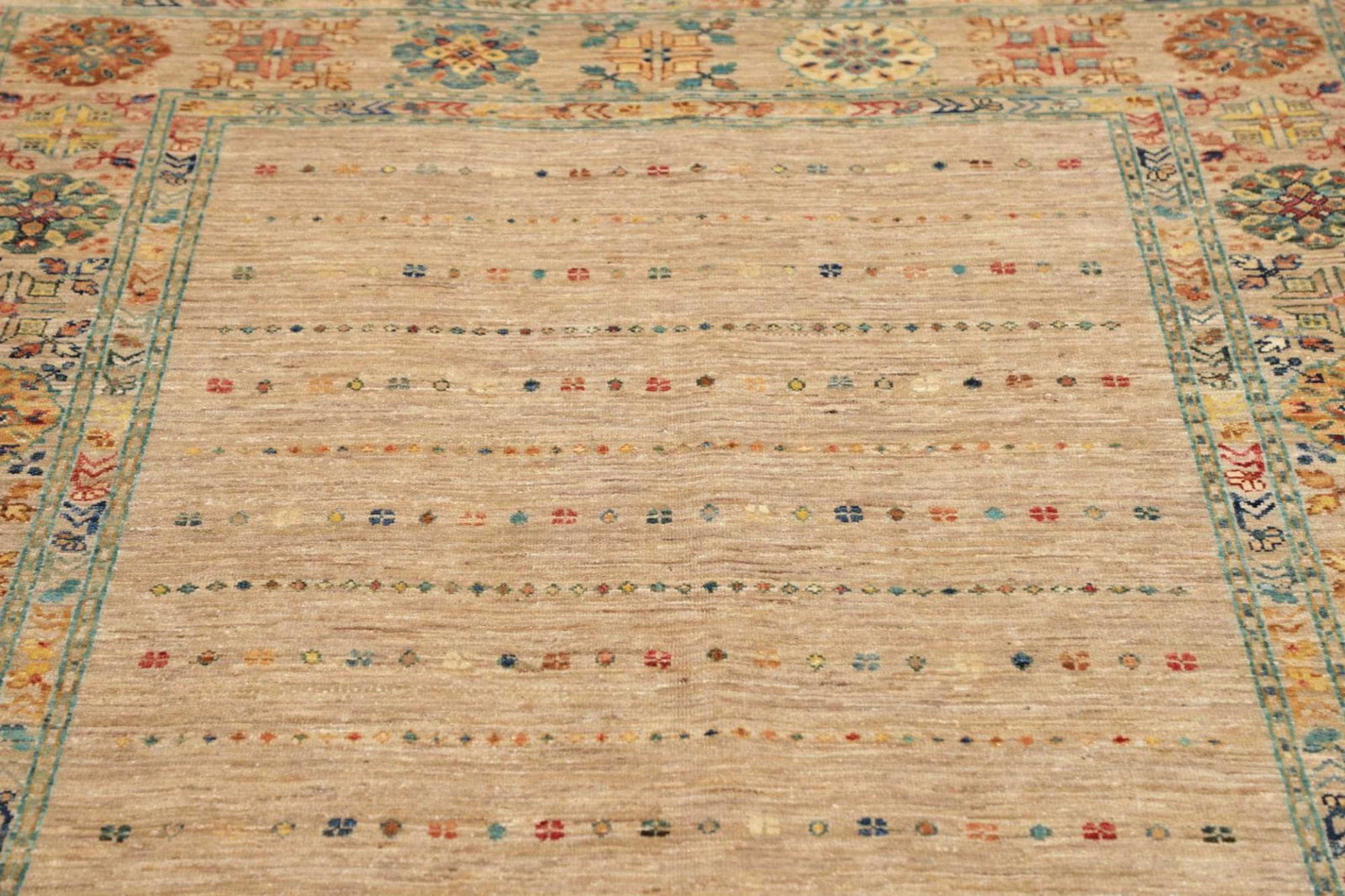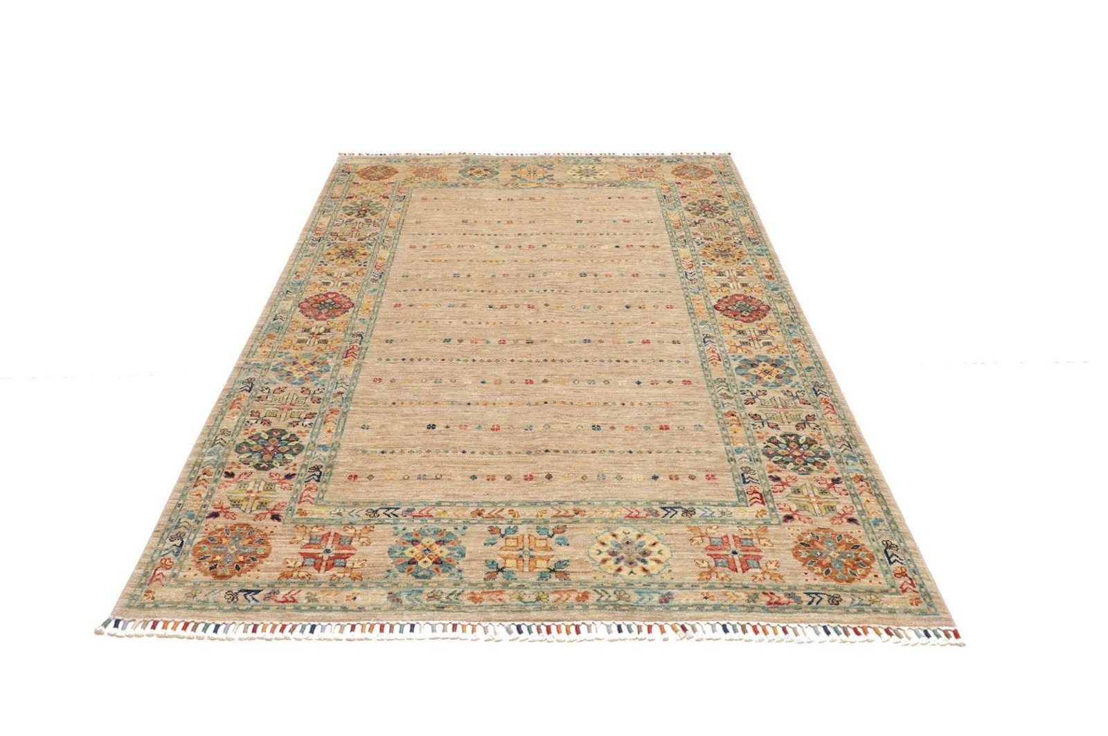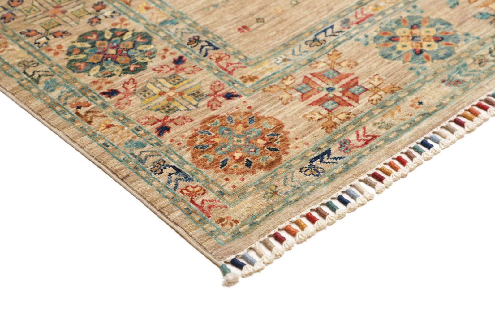 | Herkunft: Samarkand, Pakistan | Knotendichte: ca. 200.000 Knoten/m² | Flor: 100% Schurwolle | Kette: 100% Baumwolle | Größe: 148 x 209 cm | Höhe: ca. 5-7 mm | Zustand: Handgeknüpft, hohe Strapazierfähigkeit | Modernes, orientalisches Muster mit farbenfrohem Charakter |