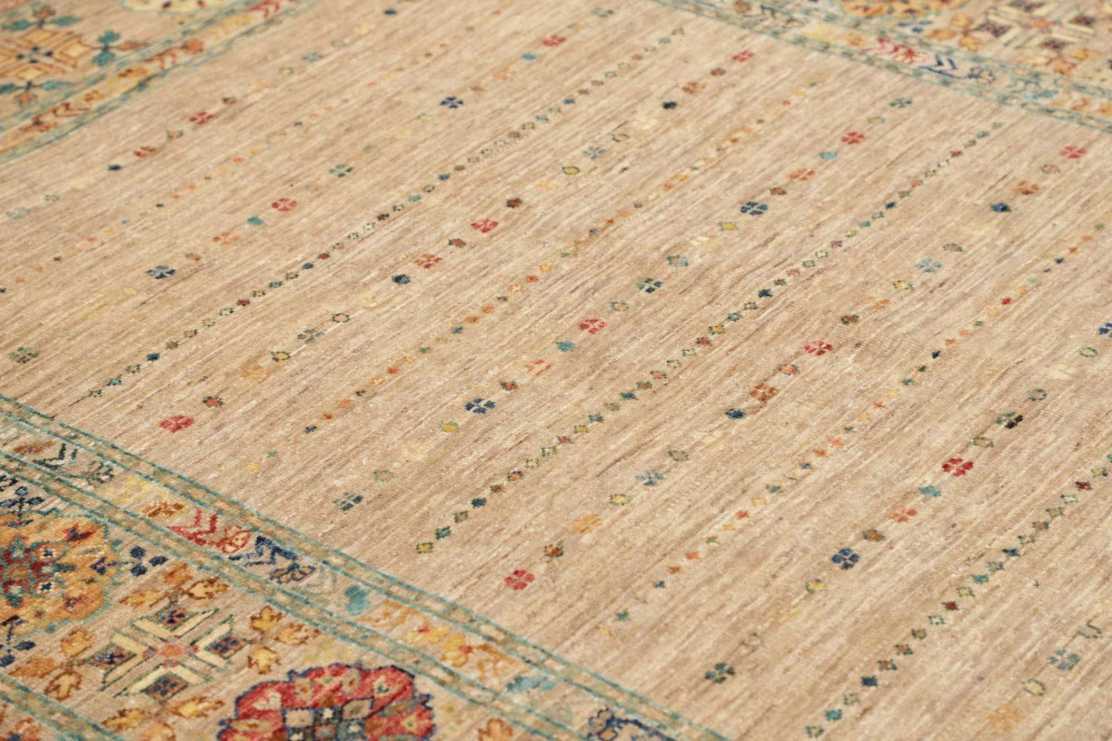 Der florale Stil des Orientteppichs Samarkand ist ein hervorragendes Beispiel für die traditionelle Teppichkunst. Blumenmuster und Pflanzenornamente ziehen sich durch das gesamte Design und schaffen ein harmonisches Bild, das lebendig und gleichzeitig beruhigend wirkt. Diese symmetrische Anordnung der Elemente vermittelt nicht nur ästhetische Anziehungskraft, sondern steht auch symbolisch für Wachstum und Harmonie. Die Farben sind sorgfältig ausgewählt und harmonisch aufeinander abgestimmt, wodurch der Teppich sowohl in modernen als auch in traditionellen Wohnräumen zur Geltung kommt.