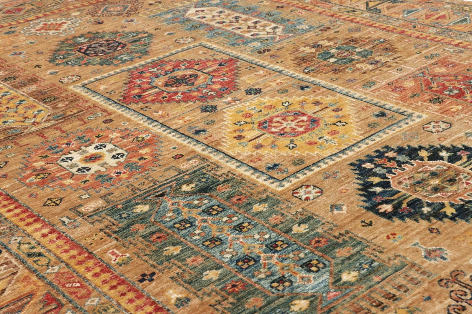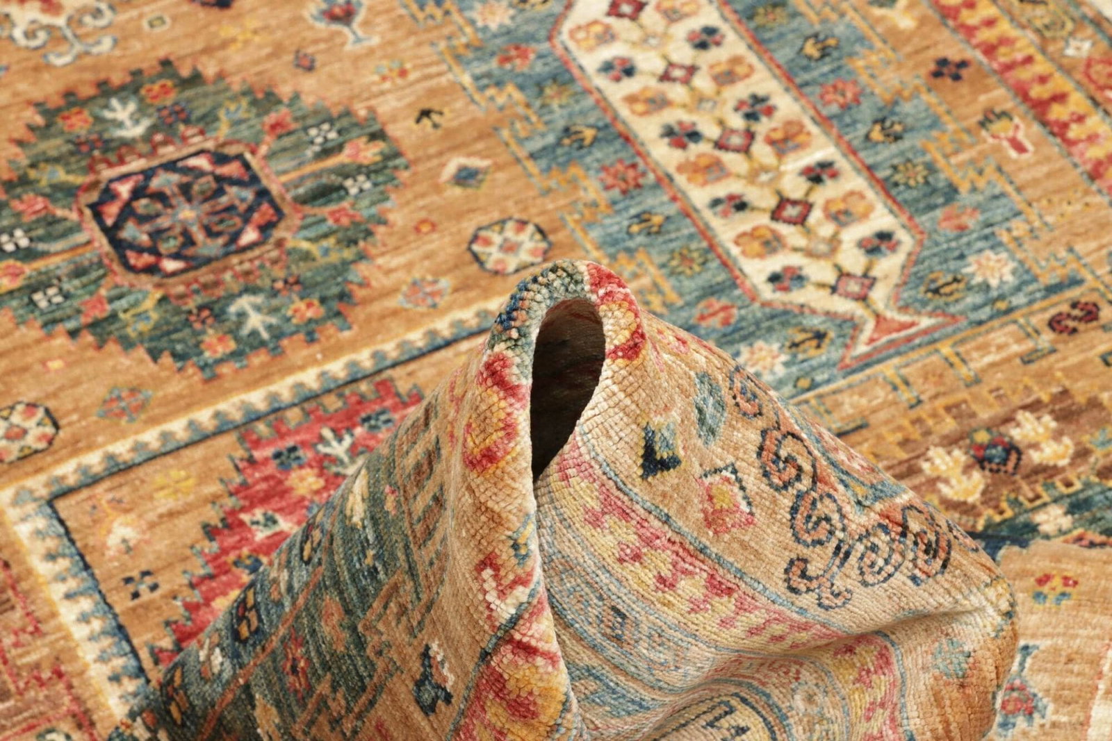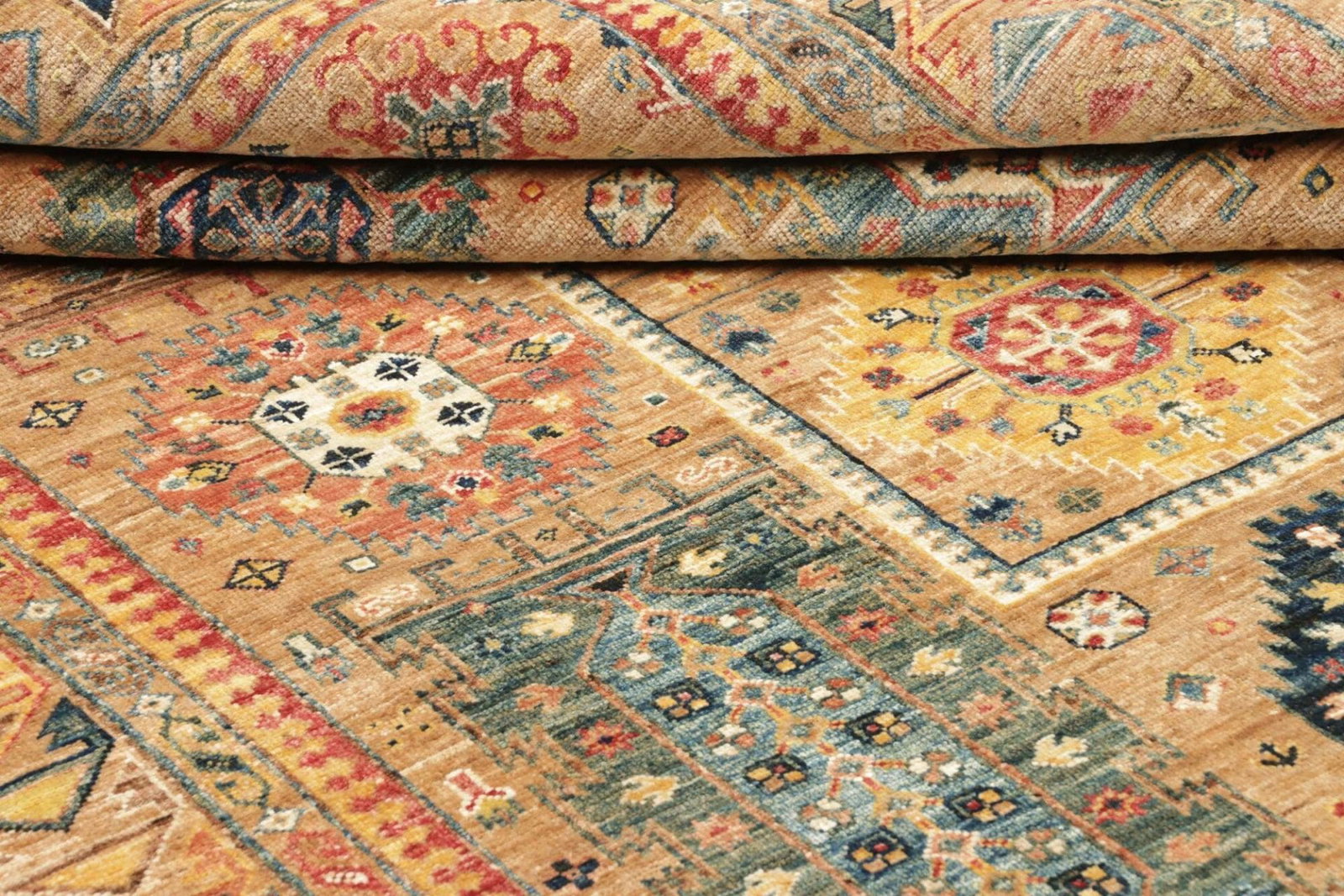 Der Orientteppich Samarkand wird komplett aus feiner Wolle gefertigt, die eine hervorragende Voraussetzung für die Haltbarkeit und den Komfort des Teppichs schafft. Wolle gilt nicht nur als eines der besten Materialien für Teppiche, sondern auch als umweltfreundlich. Durch die handgeknüpfte Technik, bei der jeder Knoten von erfahrenen Kunsthandwerkern sorgfältig gesetzt wird, erhält dieser Teppich seine unverwechselbare Textur und Qualität. Die Knotendichte ist hoch, was zu einem satten, voluminösen Aussehen beiträgt und die Farben intensiv hervorhebt.