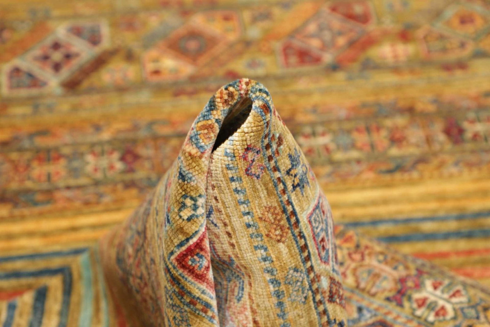 Dank der hohen Knotendichte zeichnet sich der Teppich durch eine hervorragende Qualität aus. Diese Dichte ist ein Indikator für die Sorgfalt und das Handwerk, das in die Herstellung geflossen ist. Je höher die Knotendichte, desto feiner wird das Muster, was dem Teppich eine exklusive Ausstrahlung verleiht.