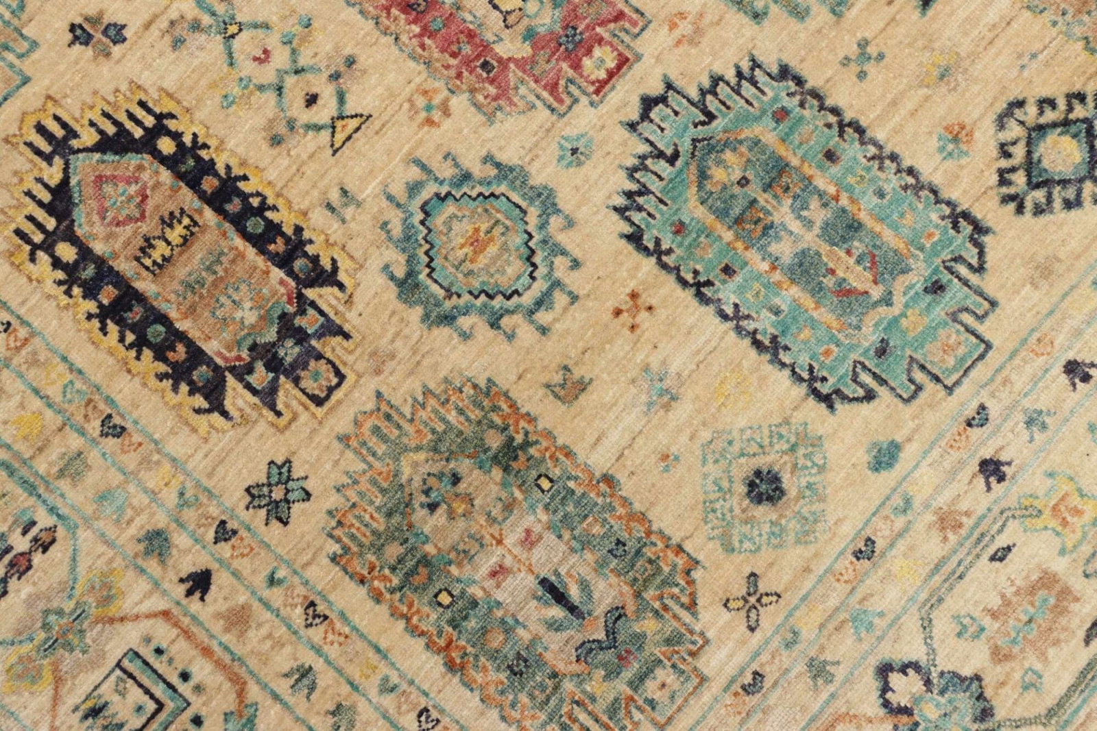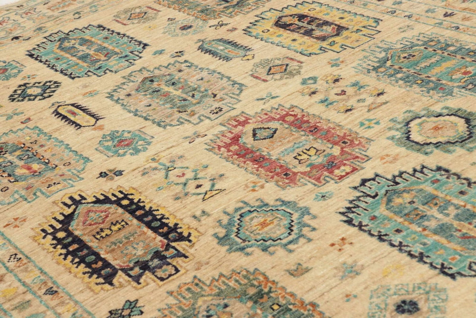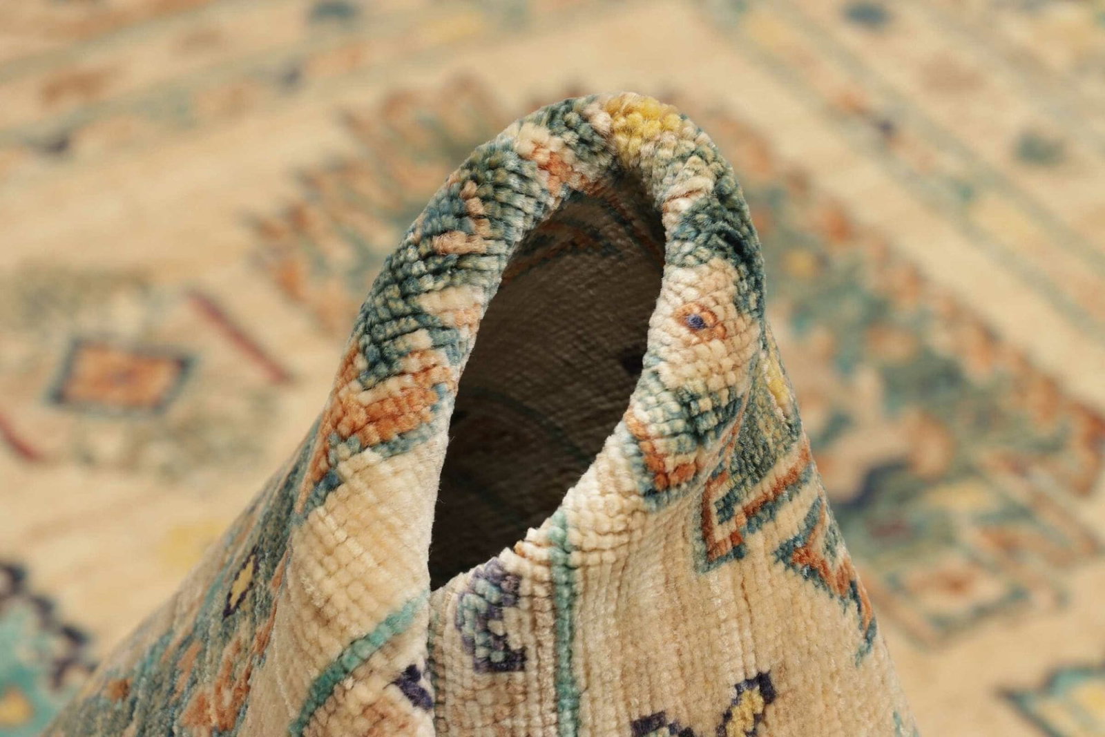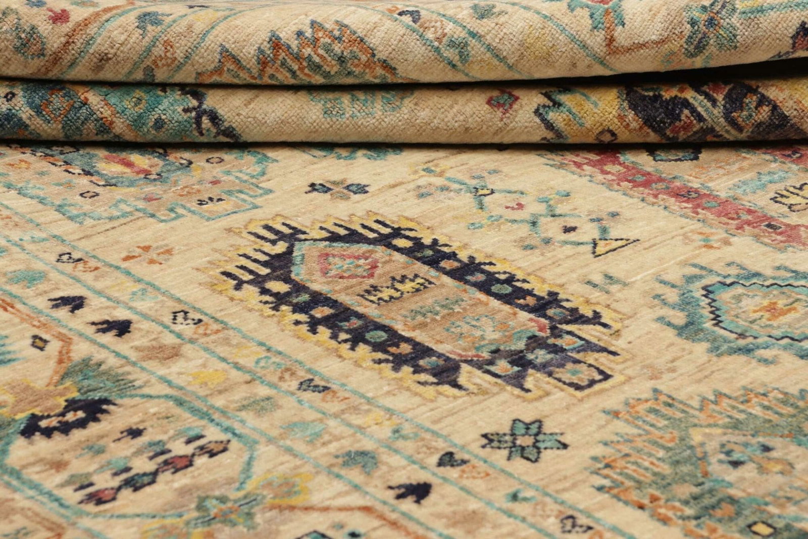 Der Teppich ist aus 100 % bester Wolle handgeknüpft, was nicht nur für eine hohe Qualität, sondern auch für eine lange Lebensdauer sorgt. Wolle ist von Natur aus schmutzabweisend und pflegeleicht, was den Teppich besonders gut für den täglichen Gebrauch geeignet macht. Zudem sorgt das handgeknotete Verfahren für eine hohe Knotendichte, die das Muster präzise zur Geltung bringt und die Struktur des Teppichs unterstützt.