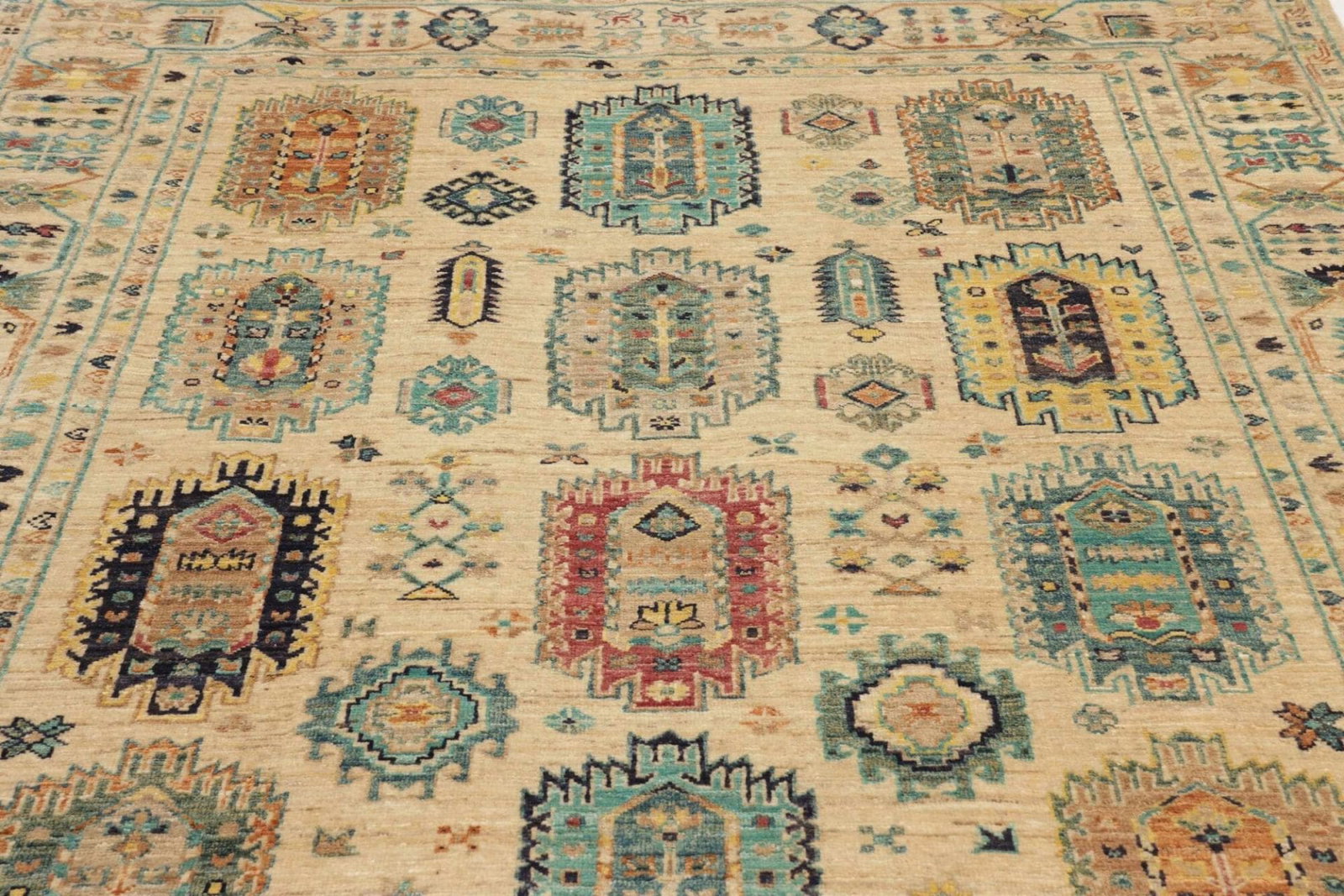 Der Teppich stammt aus der Region Samarkand, die für ihre jahrhundertealte Teppichtradition bekannt ist. Samarkand ist eine der ältesten Städte Zentralasiens und war ein bedeutendes Zentrum der Seidenstraße. Der Handel und die kulturellen Einflüsse, die durch diese Route flossen, bereicherten die Webkunst der Region erheblich. Teppiche aus Samarkand sind bekannt für ihre lebhaften Farben und komplizierten Designs, die oft Symbole der Natur oder traditionelle geomatische Muster abbilden.