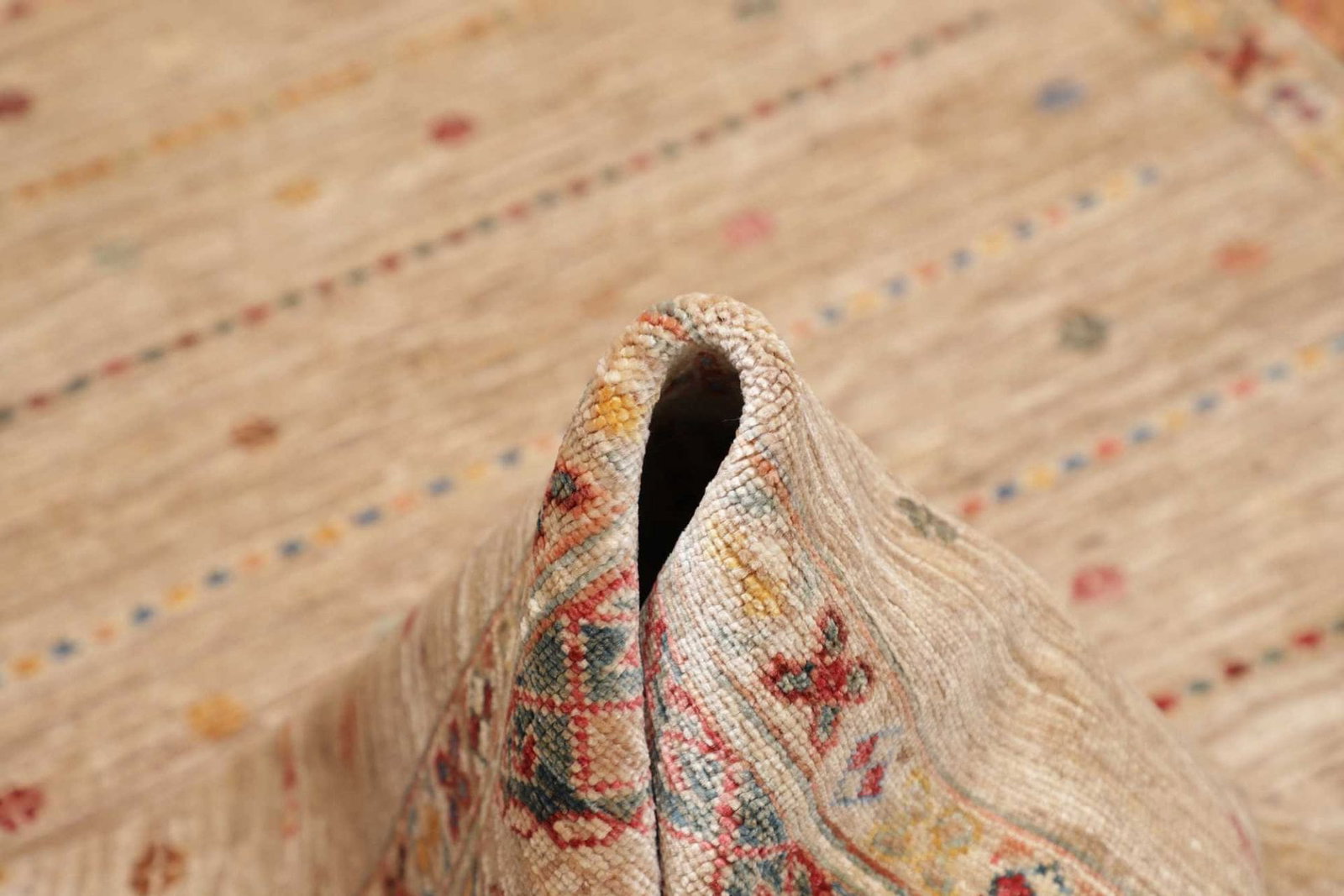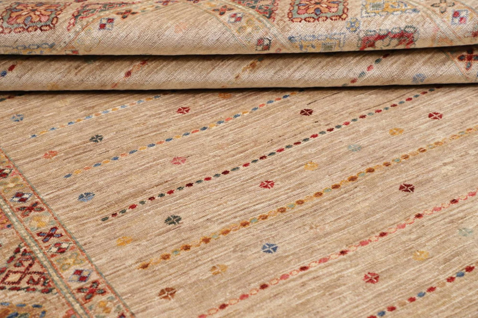 Der Teppich ist aus qualitativ hochwertiger Schurwolle hergestellt, die für ihre Langlebigkeit und ihren weichen Griff bekannt ist. Durch das Handknüpfen ergibt sich eine dichte Knotenzahl, die für die Stabilität und die Strapazierfähigkeit des Teppichs von entscheidender Bedeutung ist. Dieses Verfahren wird seit Jahrhunderten in der orientalischen Teppichkunst genutzt und verleiht jedem Stück einen individuellen Charakter. Die Haarschichten der Wolle sorgen für eine natürliche Wärme und eine angenehme Fußwärme, was ihn zu einer idealen Wahl für Wohnzimmer, Schlafzimmer oder auch in gewerblichen Räumen macht.