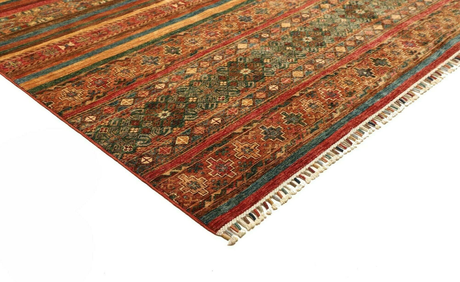 Der Orientteppich Samarkand ist ein wahrhaftes Meisterwerk, das mit viel Liebe zum Detail handgeknüpft wurde. Sein besonders hochwertiges Material aus Wolle garantiert nicht nur eine angenehme Haptik, sondern auch eine bemerkenswerte Langlebigkeit. Wolle ist bekannt für ihre isolierenden Eigenschaften und ihre Fähigkeit, den Teppich auch in stark frequentierten Bereichen zu schützen. Dieses Kunstwerk überzeugt durch seine leuchtenden Farben und die vielfältigen Muster, die jedem Raum einen Hauch von Exotik und Eleganz verleihen.