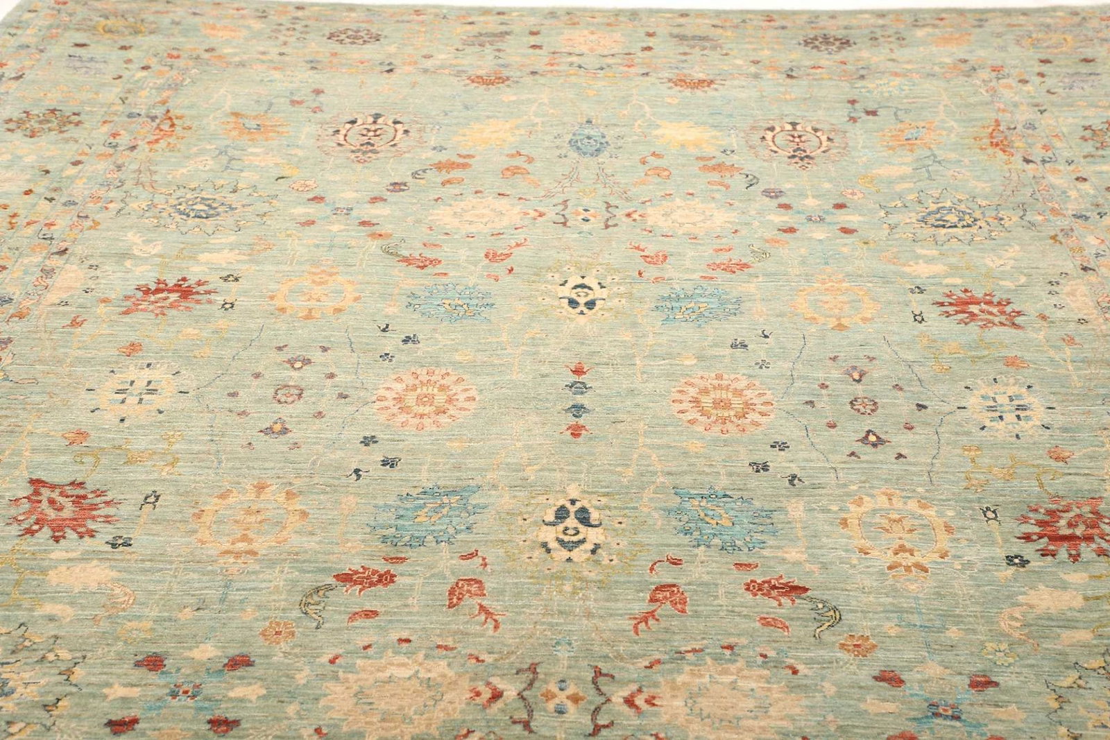 15184$Ursprünglicher Preis war: 15184$12121$Aktueller Preis ist: 12121$Handgeknüpfter Samarkand Teppich | Knotendichte: ca. 300.000 Knoten/m² | Material: 100% Schurwolle | Größe: 275 x 378 cm | Herkunft: Pakistan | Zustand: Ausgezeichnet | Florhöhe: ca. 5-7 mm | Kette: 100% Baumwolle