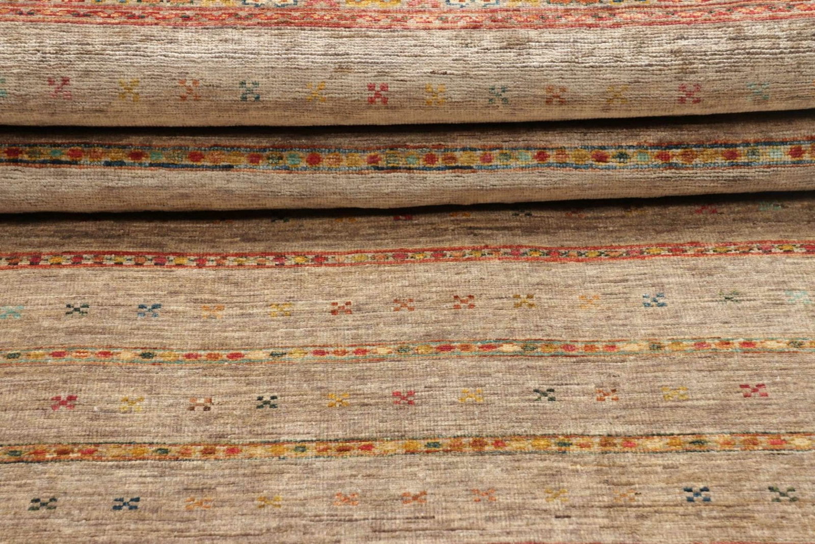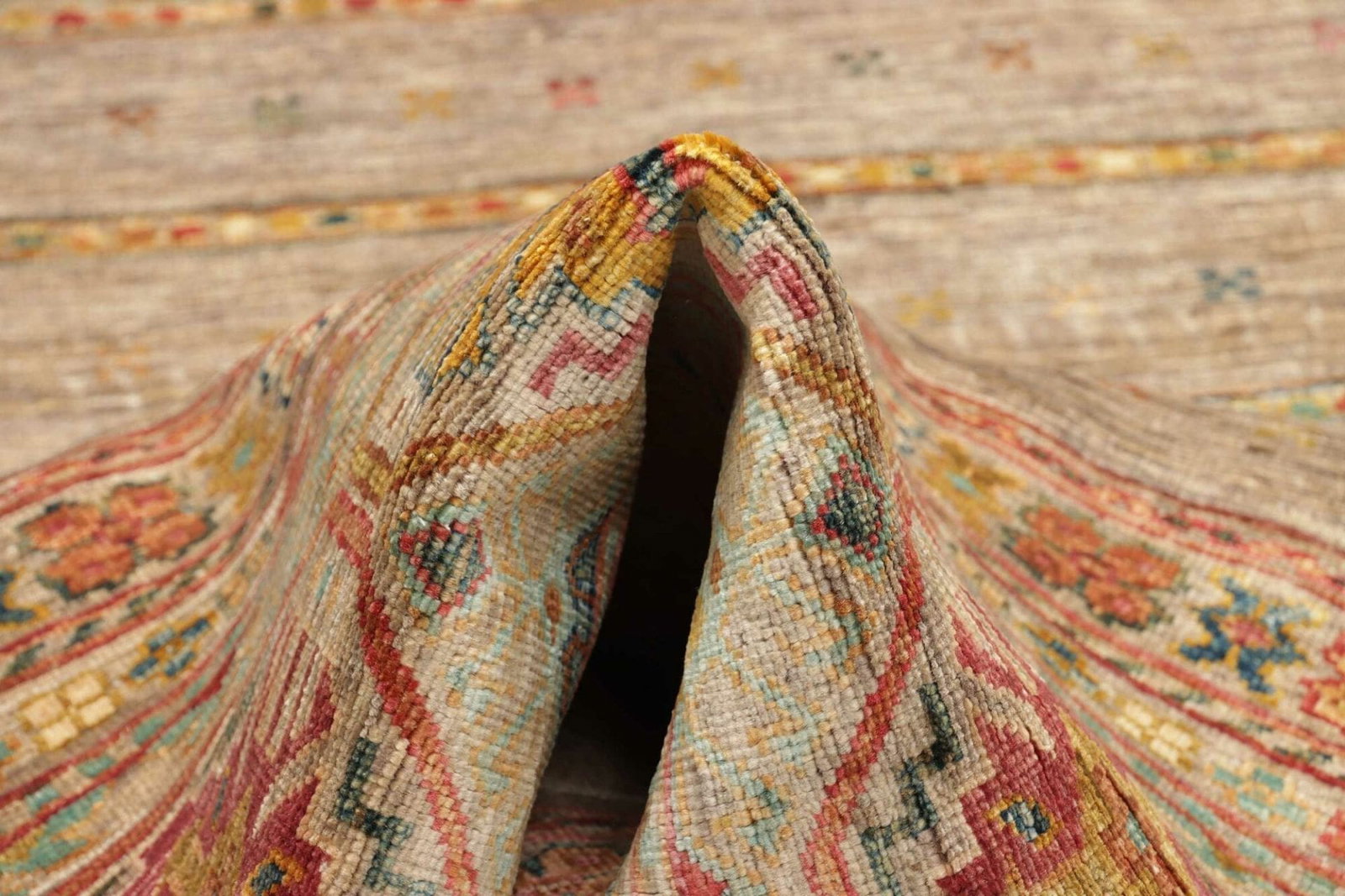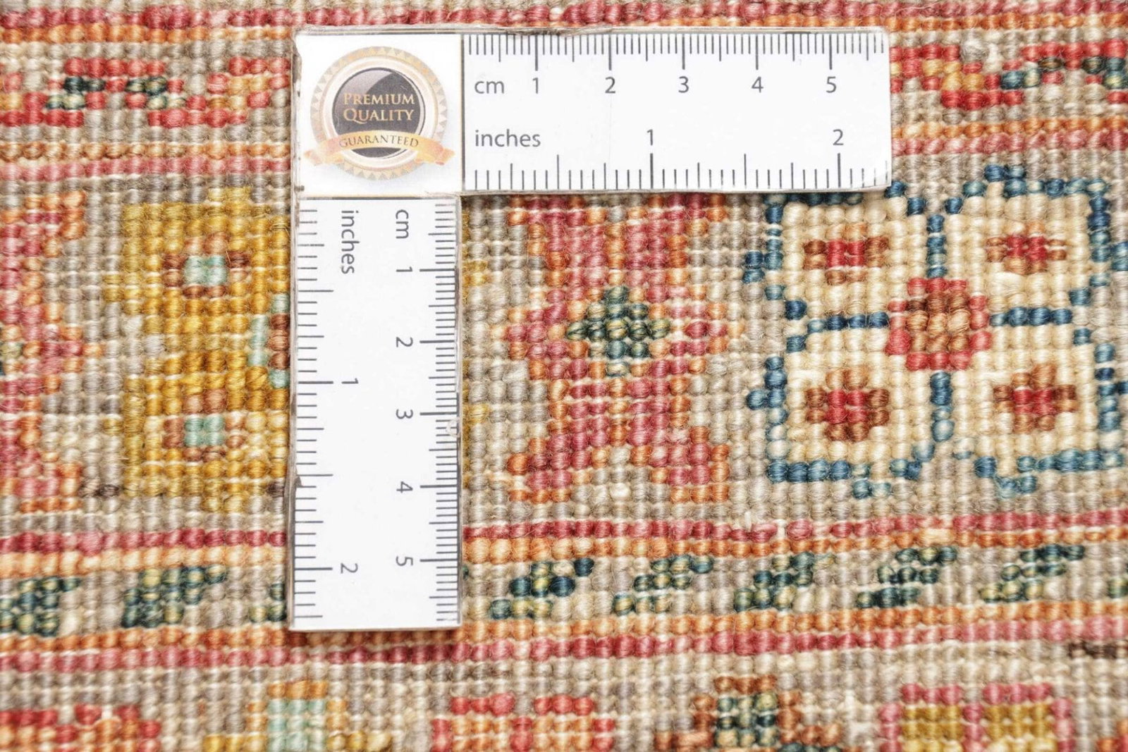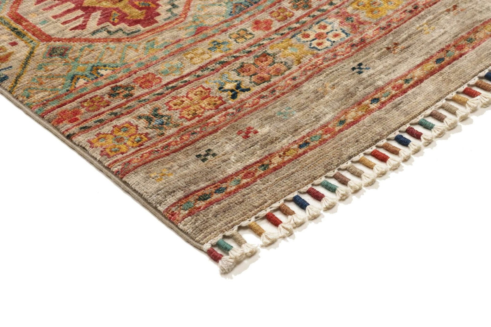 Der Teppich besteht aus 100% Schurwolle, einem Material, das für seine Weichheit, Strapazierfähigkeit und wärmenden Eigenschaften bekannt ist. Schurwolle hat die Fähigkeit, sich an verschiedene Umgebungen anzupassen, was bedeutet, dass der Teppich sowohl in kalten als auch in warmen Klimazonen angenehm zu verwenden ist. Die handgeknüpfte Verarbeitung sorgt nicht nur für eine hohe Qualität und Langlebigkeit, sondern trägt auch zu einem einzigartigen Charme bei. Jeder Knoten wird von erfahrenen Handwerkern in aufwändiger Arbeit gefertigt, was zu einer außergewöhnlichen Knotendichte führt und dem Teppich seine einmalige Textur verleiht.