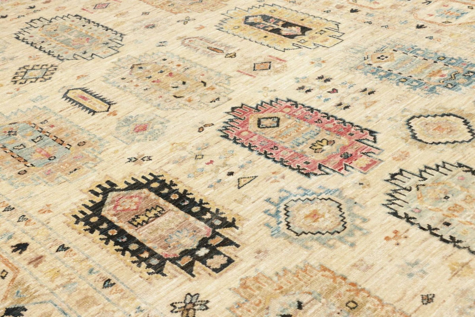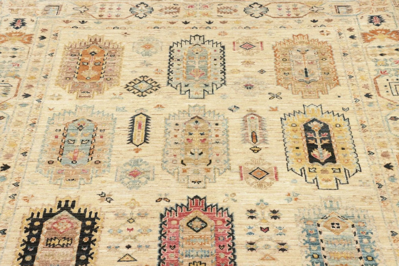 Der Orientteppich Samarkand Tribal ist ein kunstvolles handgeknüpftes Meisterwerk, das durch seine exquisite Verarbeitung und hochwertigen Materialien besticht. Hergestellt aus feinster Schurwolle, vermittelt dieser Teppich nicht nur ein Gefühl von Gemütlichkeit und Wohltat, sondern zeichnet sich auch durch seine Strapazierfähigkeit aus. Schurwolle ist für ihre Langlebigkeit und ihren natürlichen Glanz bekannt, was diesem Teppich eine unvergleichliche Eleganz verleiht.