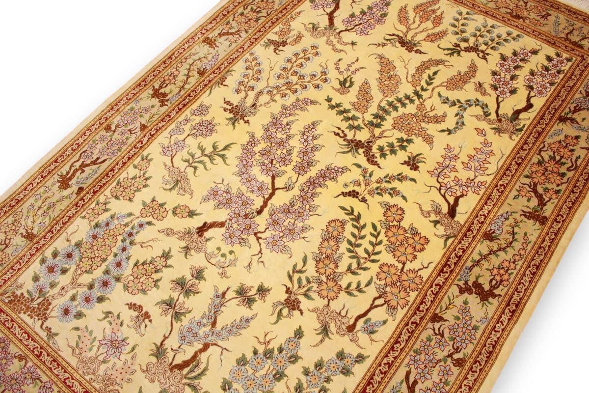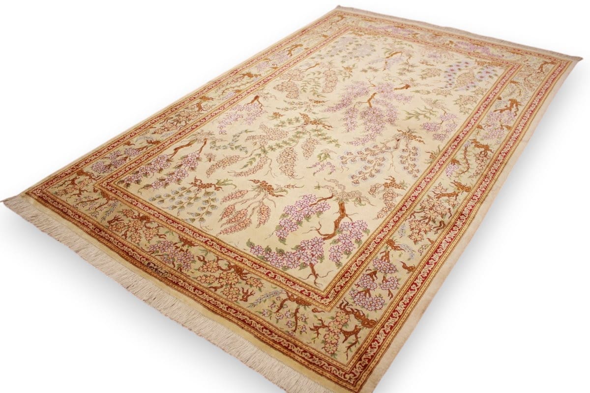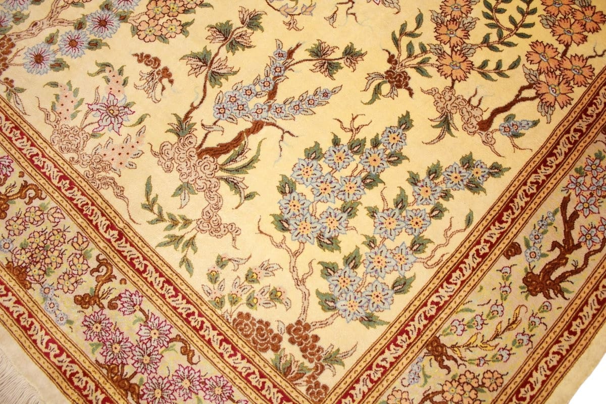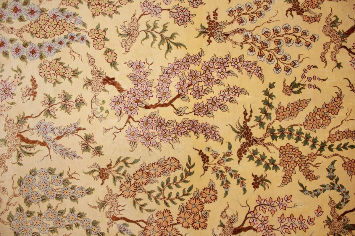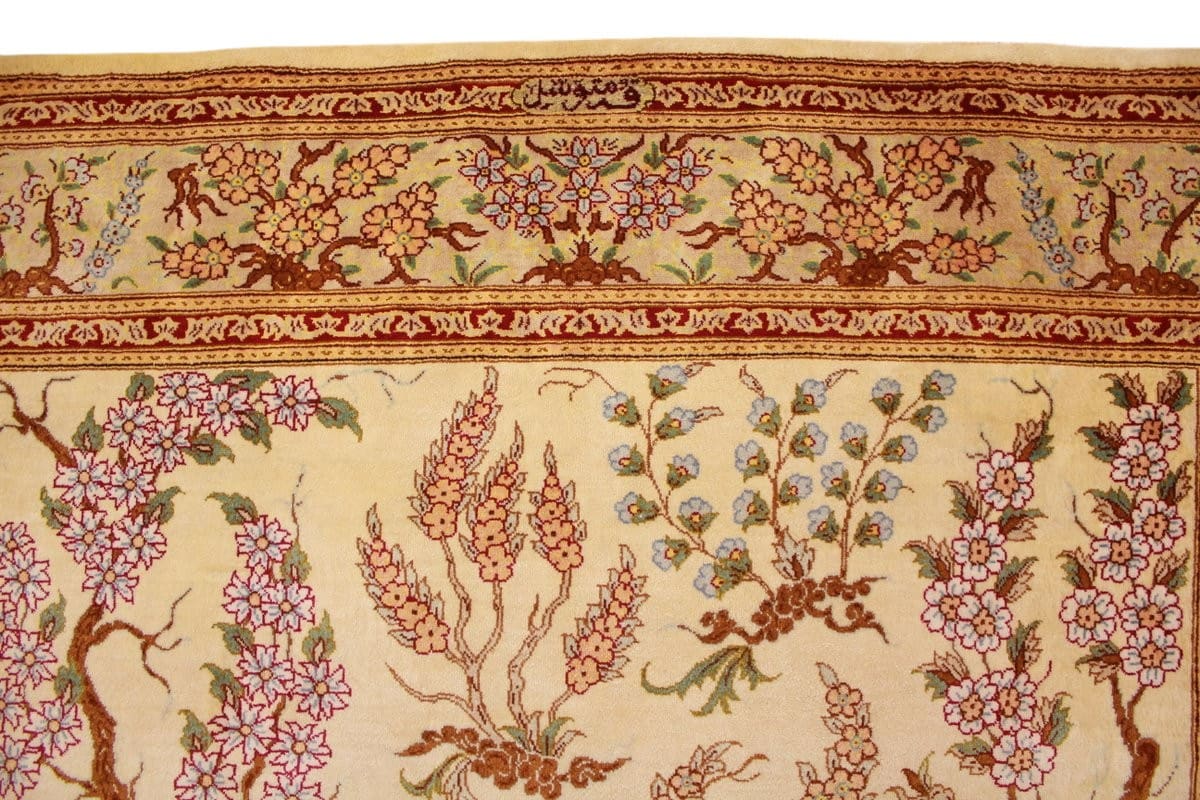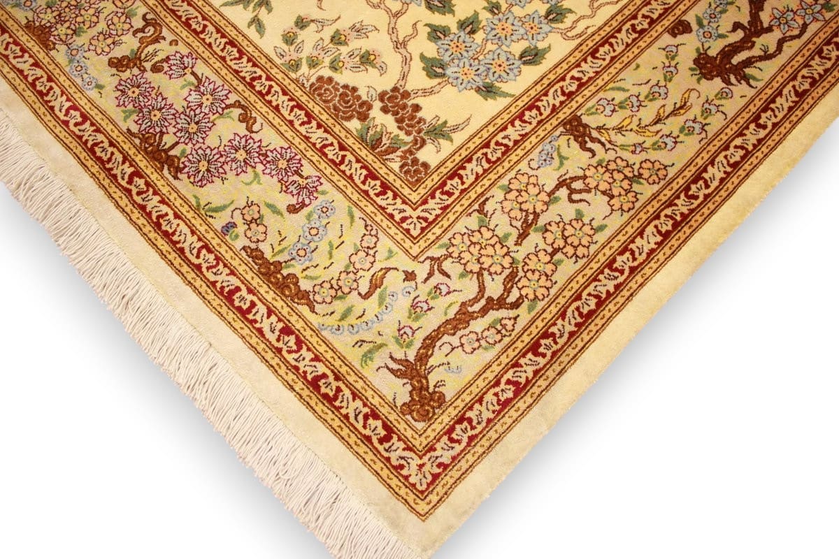 Die handgeknüpfte Technik, gepaart mit der Verwendung von luxuriöser Seide, macht diesen Teppich zu einem einzigartigen Stück für Ihr Zuhause. Darüber hinaus ist der Zustand des Teppichs ausgezeichnet, was ihn zu einer lohnenden Investition für Sammler und Liebhaber orientalischer Kunst macht. Die Pflege eines solchen Teppichs ist vergleichbar mit der Pflege anderer hochwertiger Textilien: Regelmäßiges Staubsaugen und gelegentliche professionelle Reinigung sorgen für Langlebigkeit und Erhalt der Farben und Muster.