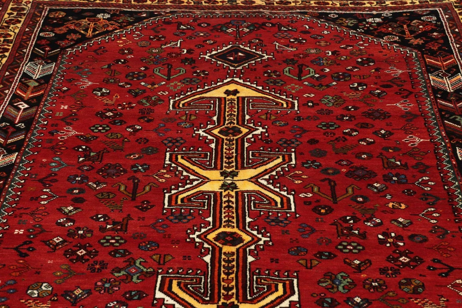 Der Teppich stammt ursprünglich aus der Region Shiraz, einer Stadt im Süden Irans, die für ihre reiche Teppichknüpftradition berühmt ist. Shiraz ist nicht nur für seine beeindruckenden Teppiche bekannt, sondern auch für seine bezaubernde Landschaft und kulturellen Schätze. Die Teppiche aus dieser Region sind oft mit geometrischen Mustern und lebhaften Farben gestaltet, die von der reichen Geschichte und den Traditionen der persischen Kultur inspiriert sind. Ein Teppich aus Shiraz erzählt Geschichten von Handwerkskunst, die Jahrhunderte alt ist, und die Wertschätzung für Ästhetik und Detailreichtum widerspiegelt.