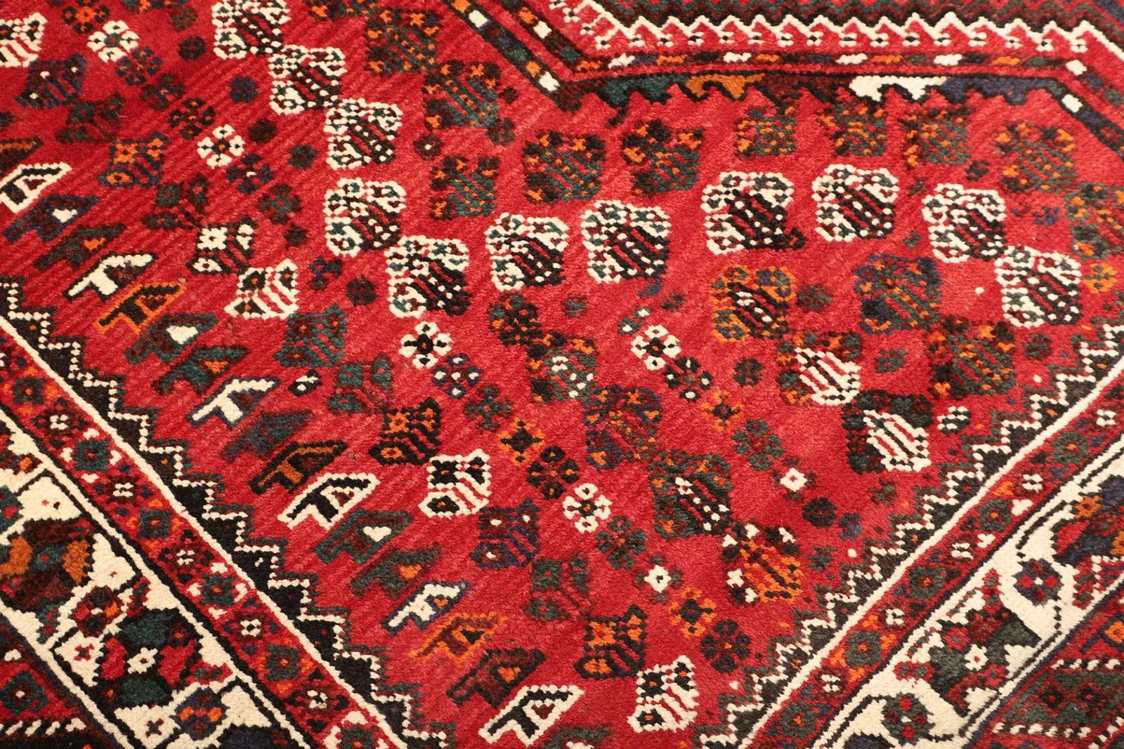 Shiraz Teppich | Knotendichte: ca. 200.000 Knoten/m² | Material: 100% Schurwolle | Kette: 100% Baumwolle | Größe: 213 x 297 cm | Zustand: Handgeknüpft | Ursprung: Iran | Muster: Geometrisch