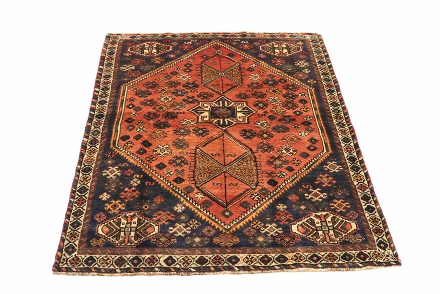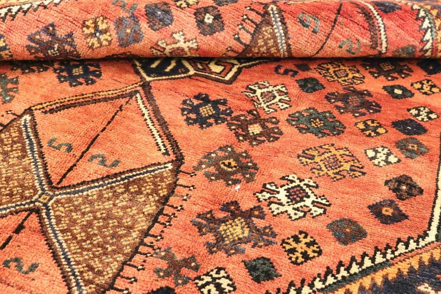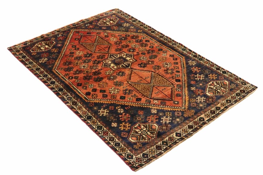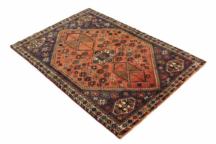 | Traditioneller Shiraz-Teppich | Knotendichte: 90.000 Knoten/m² | Material: Wolle und Baumwolle | Größe: 213×145 cm | Farbe: Rot/Orange | Zustand: Neu | Ursprung: Iran/Persien | Form: Rechteckig