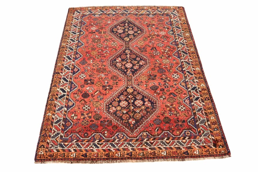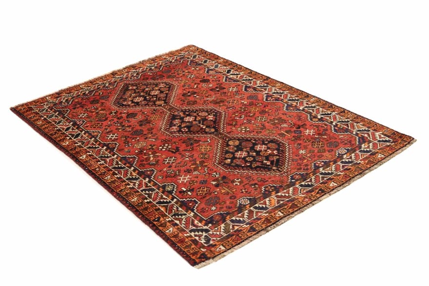 Handgeknüpfter Shiraz-Teppich | Knotendichte: 90.000 Knoten/m² | Material: Handgesponnene Wolle | Größe: 223×162 cm | Farbe: Rot/Orange | Zustand: Neu | Ursprung: Iran/Persien