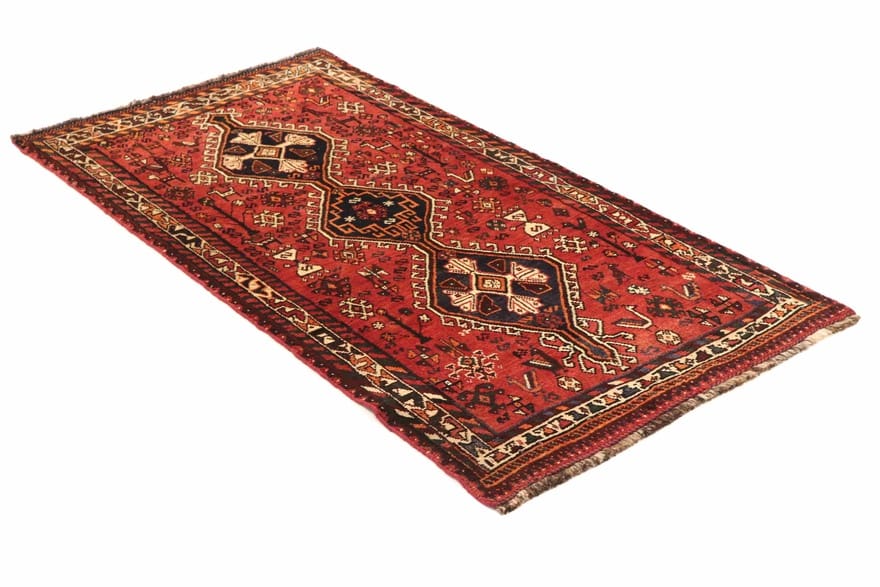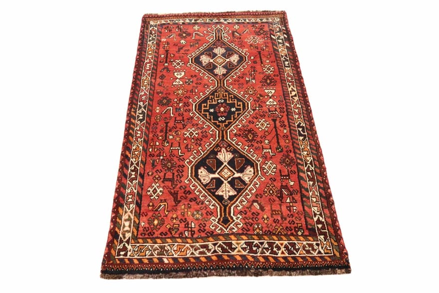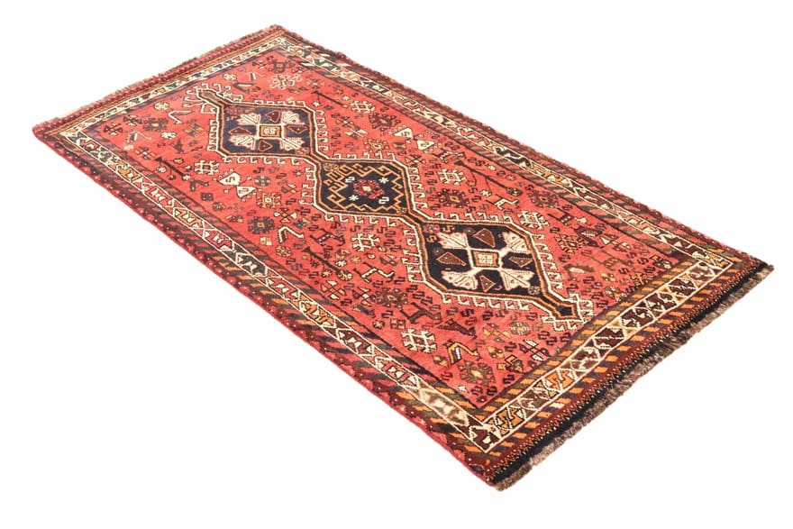 Handgeknüpfter Shiraz-Teppich | Knotendichte: 160.000 – 200.000 Knoten/m² | Material: Handgesponnene Wolle | Farbe: Rot/Orange | Größe: 228×111 cm | Zustand: Gut | Ursprung: Iran