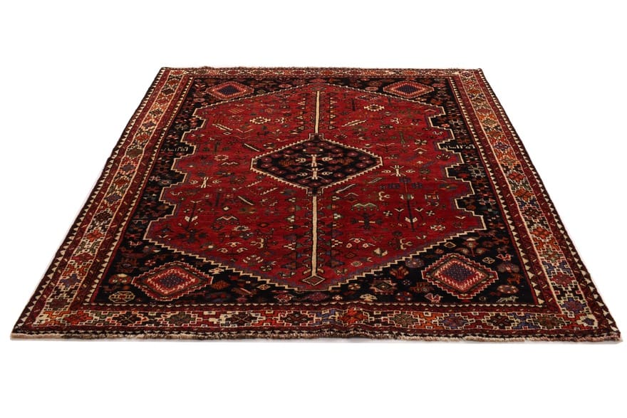 Handgeknüpfter Shiraz-Teppich | Knotendichte: 128.000 – 160.000 Knoten/m² | Material: Wolle (Kette, Schuss, Flor) | Größe: 246×181 cm | Farbe: Rot/Orange | Form: Rechteckig | Alter: Neuzeitlich (0-20 Jahre) | Herkunft: Iran / Persien | Dicke: ca. 10 mm | Gewicht: ca. 12 kg