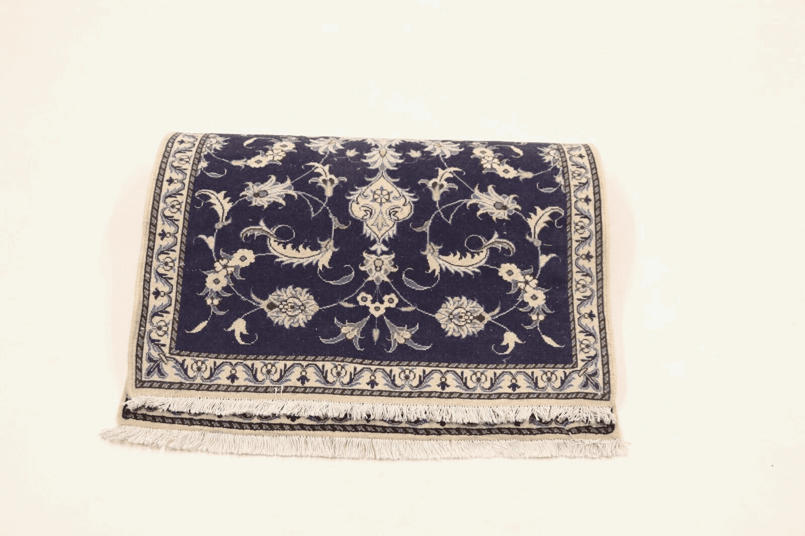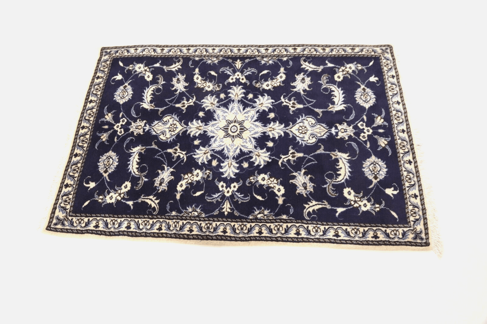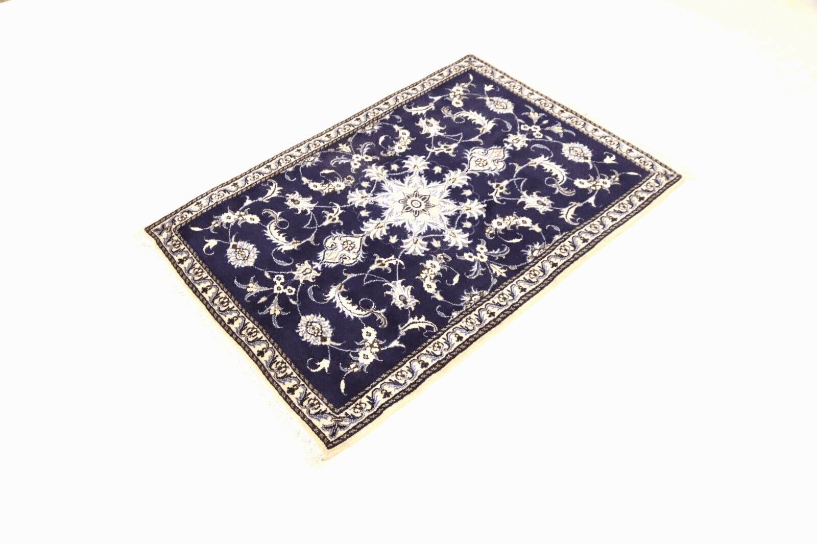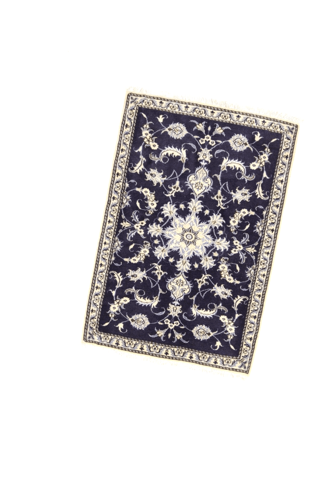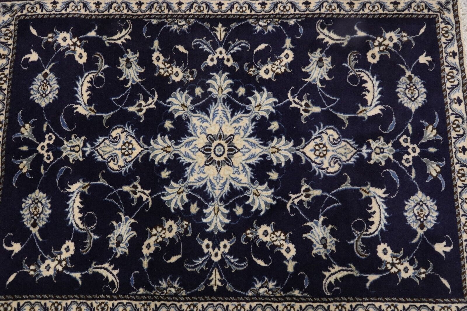 Orientteppich super Nain | Größe: 135 x 92 cm | Knotendichte: ca. 300.000 Knoten/m² | Material: 90 % Schurwolle, 10 % Seide | Zustand: Neu, sehr gut | Herkunft: Persien | Dicke: ca. 8 mm | Handgeknüpft und einzigartig | Für Fußbodenheizung geeignet, haustierfreundlich | Traditionelles orientalisches Design | Farbe: Dunkelblau