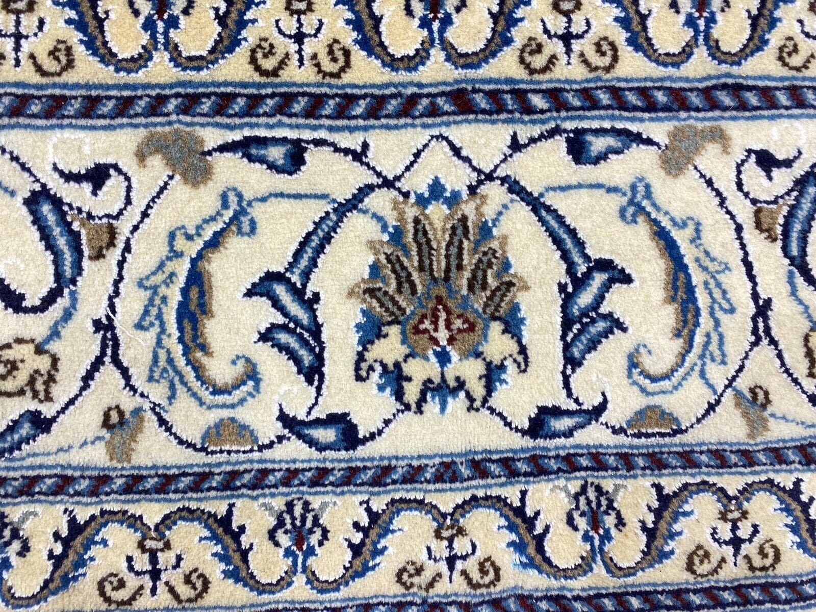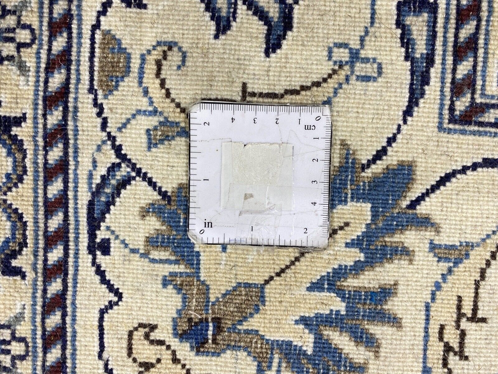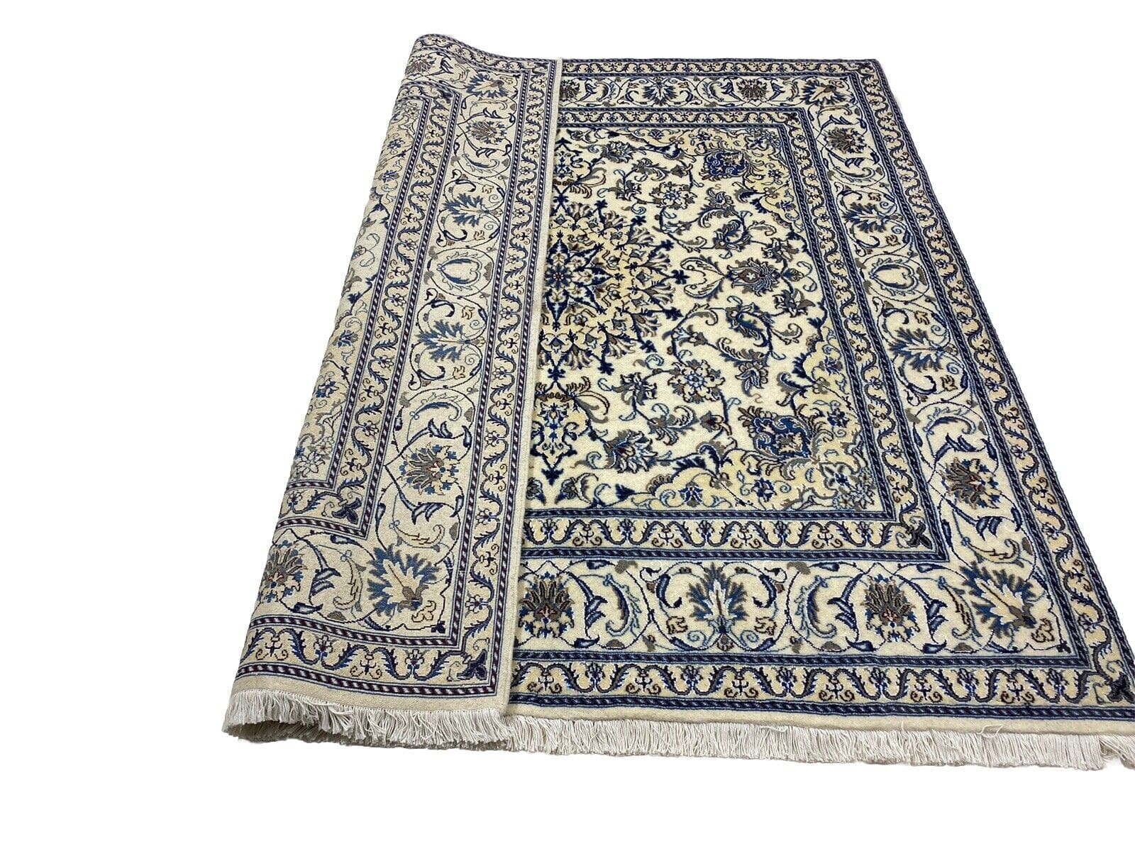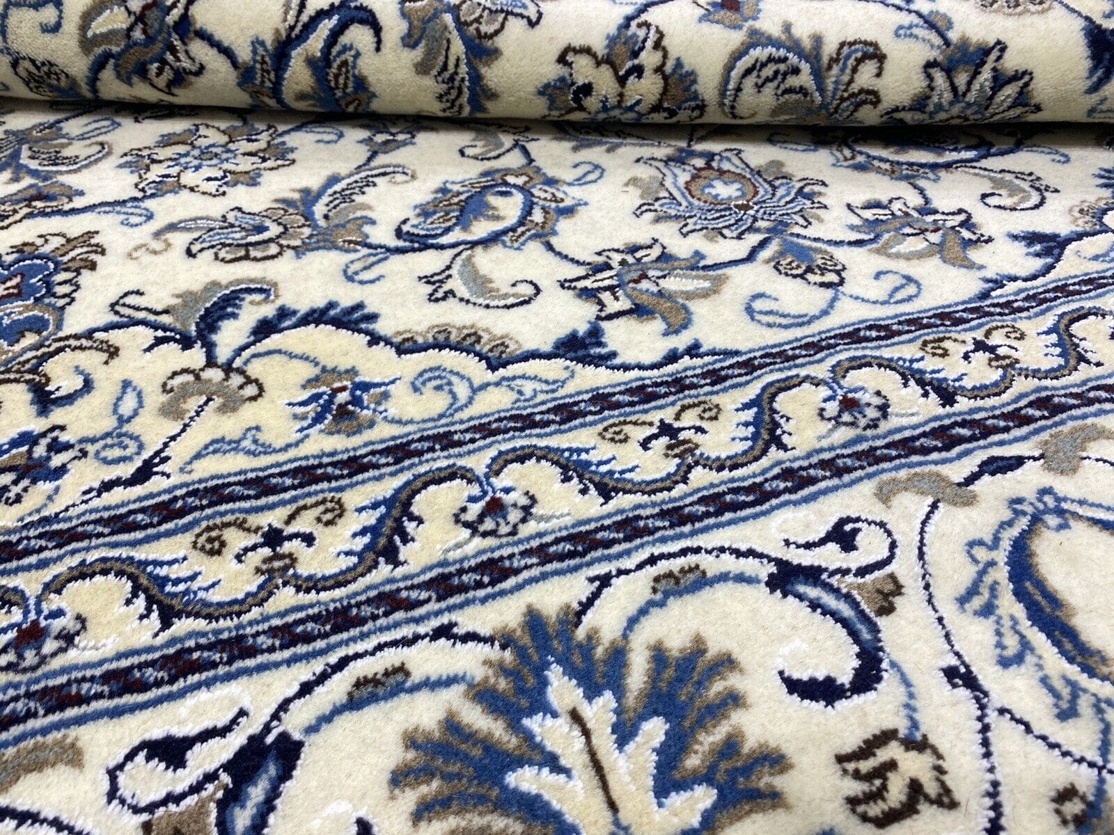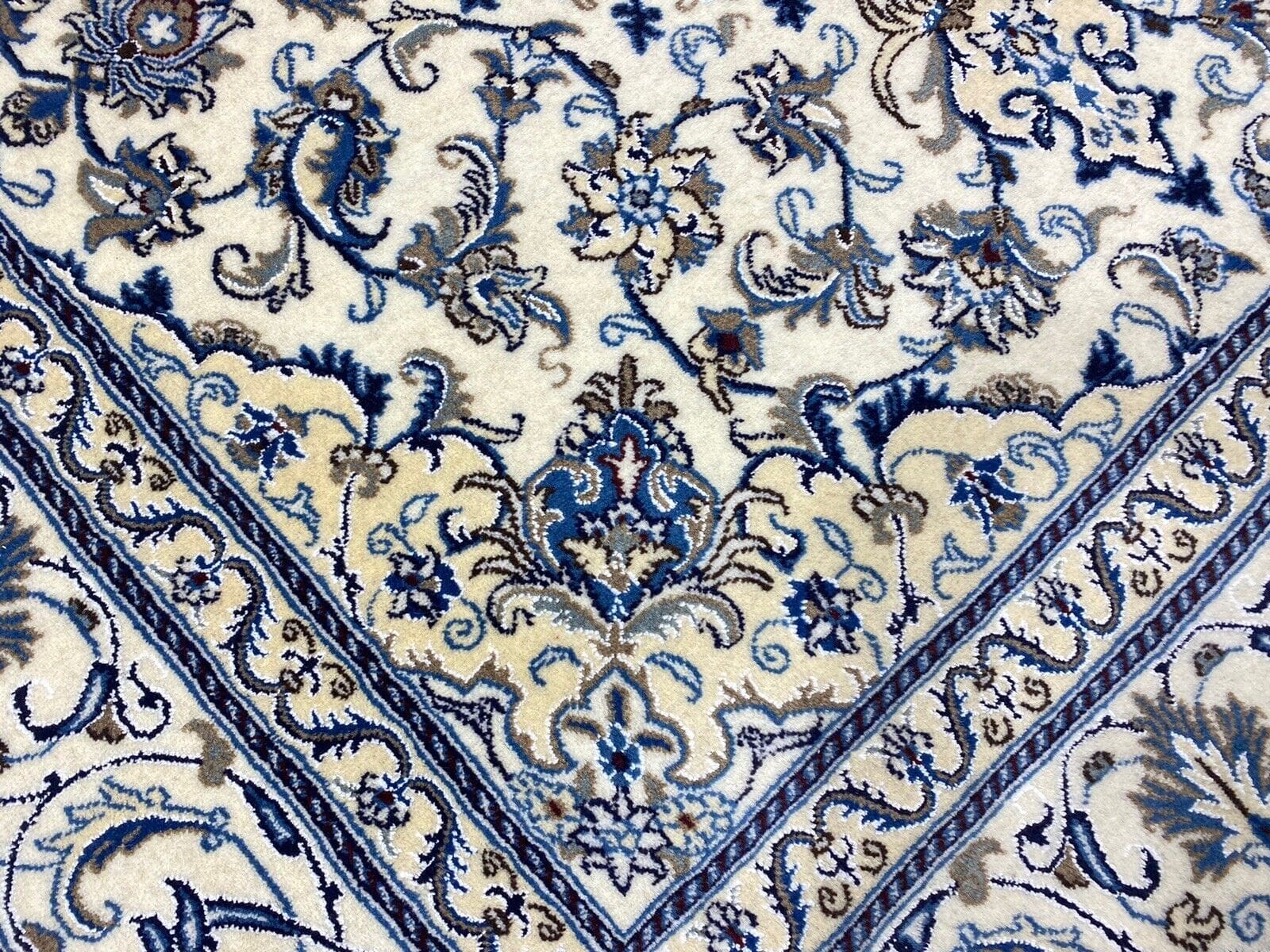 Der Zustand dieses Teppichs ist neu und in perfektem Zustand. Mit einer Dicke von ca. 8 mm und einer beeindruckenden Knotenzahl von ca. 300.000 Knoten pro Quadratmeter ist dieser Teppich ein wahres Meisterwerk der Teppichknüpfkunst. Die feinen und komplexen Muster, die typisch für Nain-Teppiche sind, erzählen Geschichten aus der reichen Kultur und Tradition Persiens. Diese Teppiche zeichnen sich durch ihre eleganten, oft floralen Designs aus und sind häufig in sanften Farbtönen gehalten, die jedem Raum eine behagliche Atmosphäre verleihen.