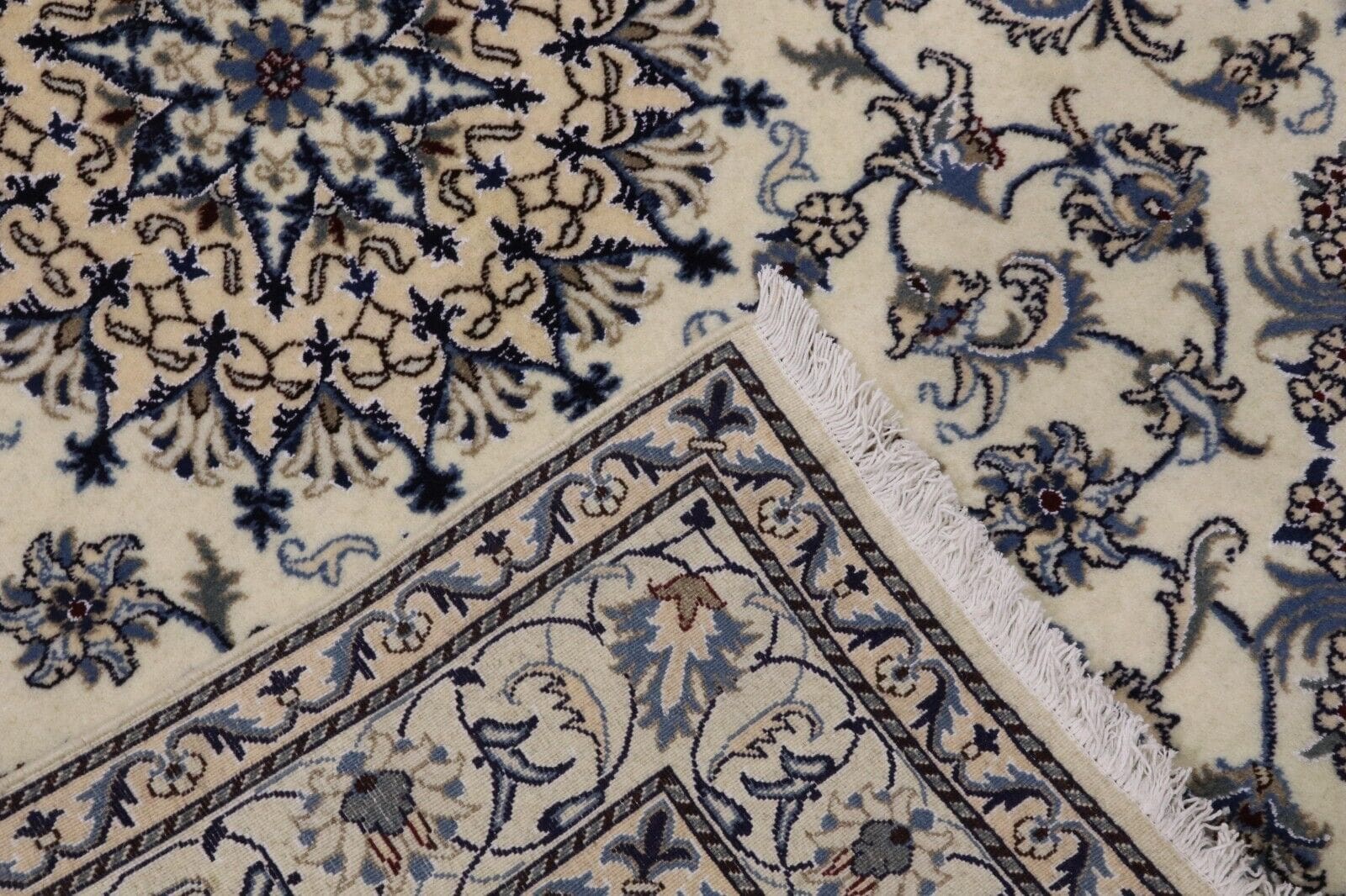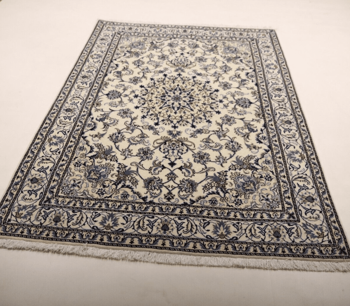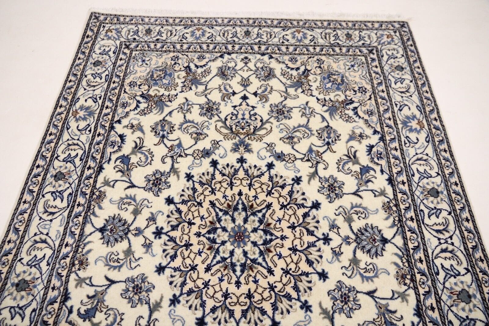Orientteppich Super Nain mit Seide | Größe: 232 x 163 cm | Knotendichte: ca. 300.000 Knoten/m² | Material: 90 % Schurwolle, 10 % Seide | Kette: 100 % Baumwolle | Zustand: Neu, sehr gut | Herkunft: Persien | Dicke: ca. 8 mm | Handgeknüpft, geeignet für Fußbodenheizung | Mottenresistent, haustier- und kinderfreundlich