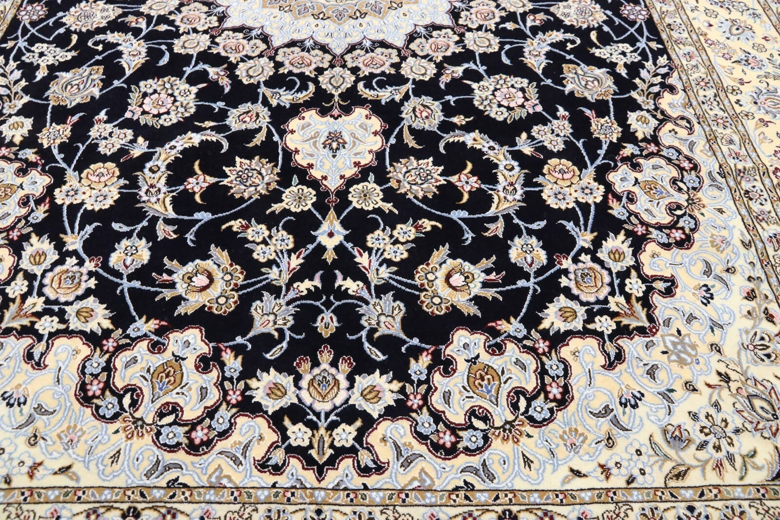 Orientteppich Super Nain 9 La | Knotendichte: ca. 500.000 Knoten/m² | Material: 90% Schurwolle, 10% Seide, Kette: 100% Baumwolle | Größe: 358×249 cm | Zustand: Neu, in perfektem Zustand | Herkunft: Persien | Stil: Traditionell Orientalisch/Persisch | Florhöhe: ca. 6 mm | Unikat/Einzelstück