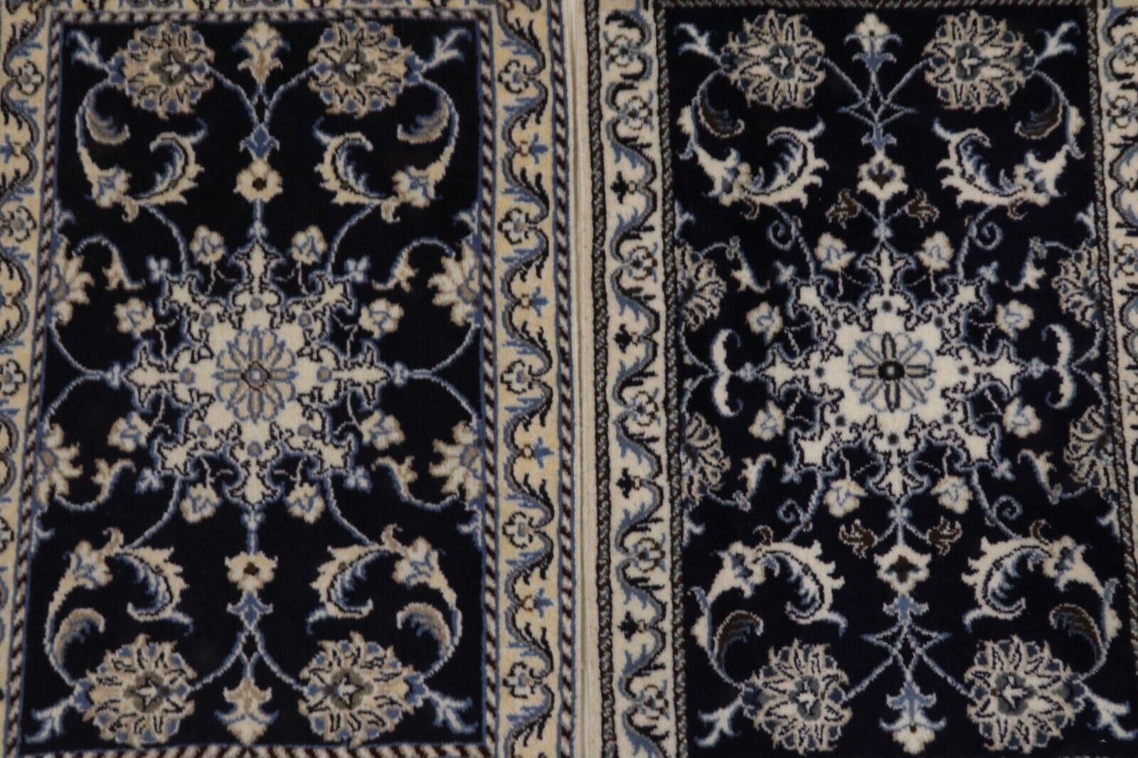 Dieser Teppich stammt aus Nain, einer Stadt im Iran, die für ihre exquisiten hochwertigen Teppiche bekannt ist. Nain hat eine lange Tradition in der Teppichknüpfkunst, die bis ins 19. Jahrhundert zurückreicht. Die Teppiche aus dieser Region zeichnen sich durch ihre feine Knotung, hohen Qualitätsstandards und einzigartigen Designs aus. Die oft verwendeten Motive sind von der floralen und geometrischen Symbolik geprägt, die in der persischen Teppichgestaltung tief verwurzelt sind.