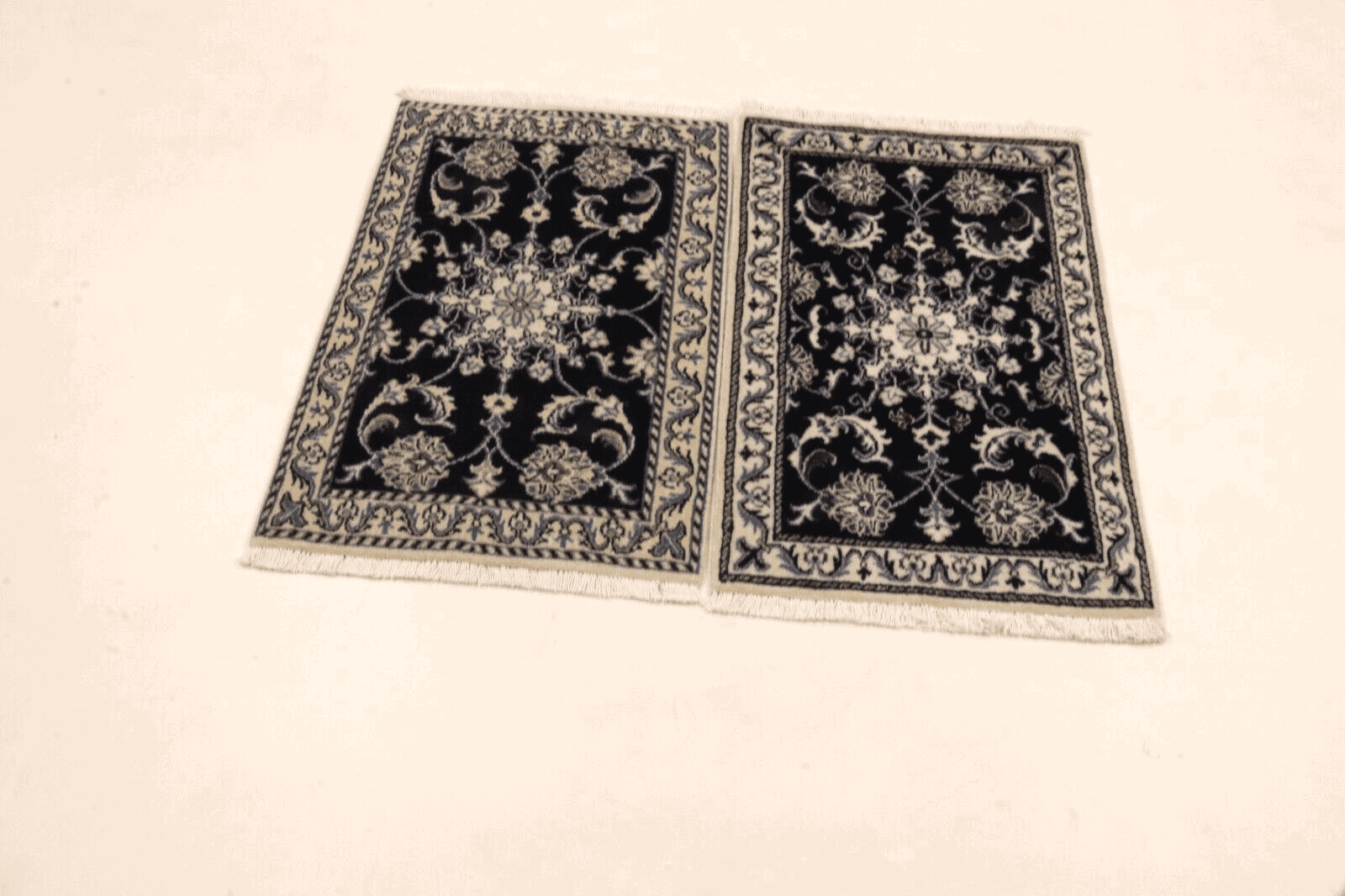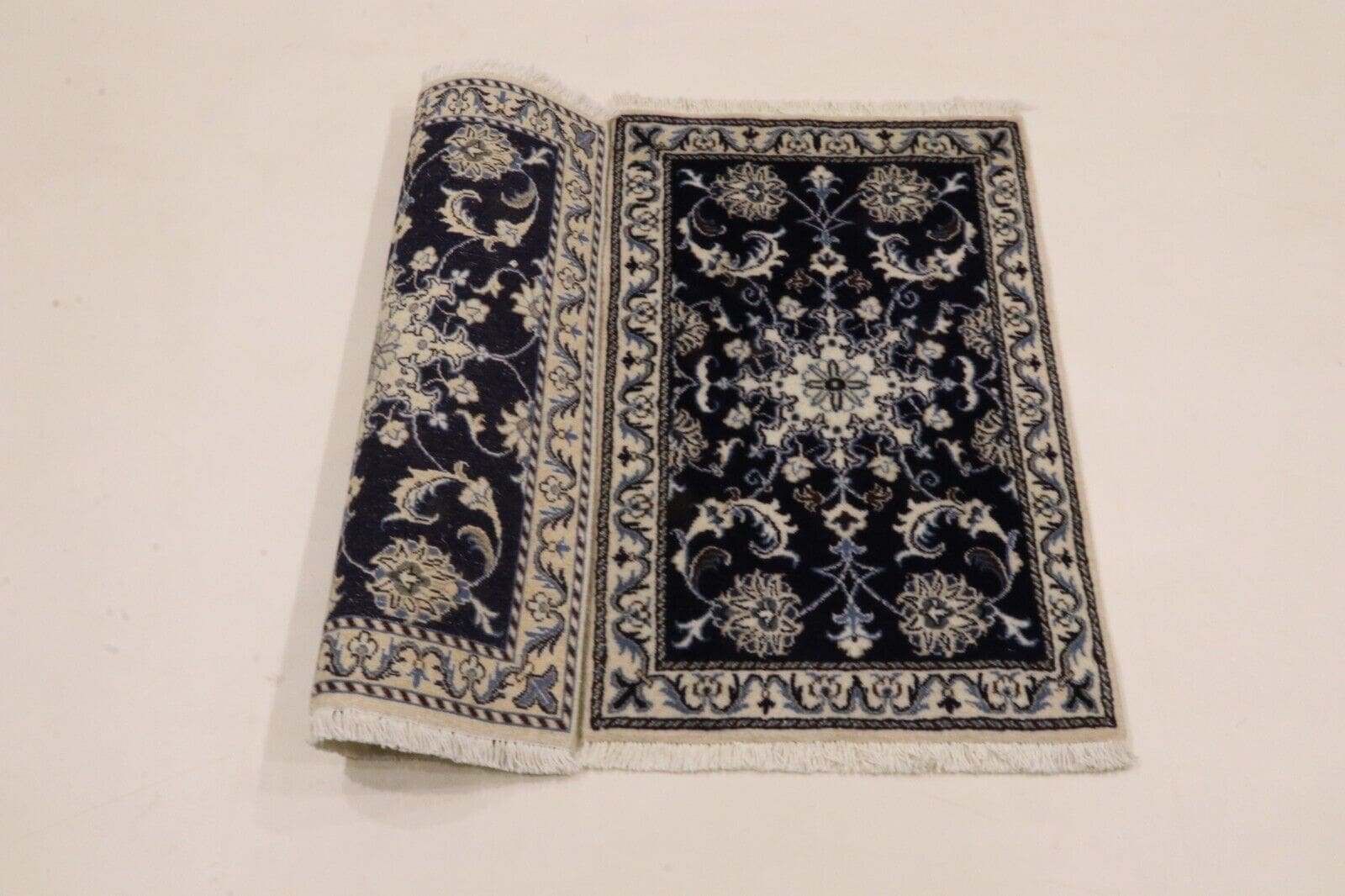 Handgeknüpfter Orientteppich | Größe: 90 x 60 cm | Material: 90% Schurwolle, 10% Seide | Knotendichte: ca. 300.000 Knoten/m² | Zustand: Neu, perfekt | Herkunft: Persien | Florhöhe: 8 mm | Farbe: Dunkelblau | Für Fußbodenheizung geeignet | Haustierfreundlich | Stil: Traditionell Orientalisch/Persisch
