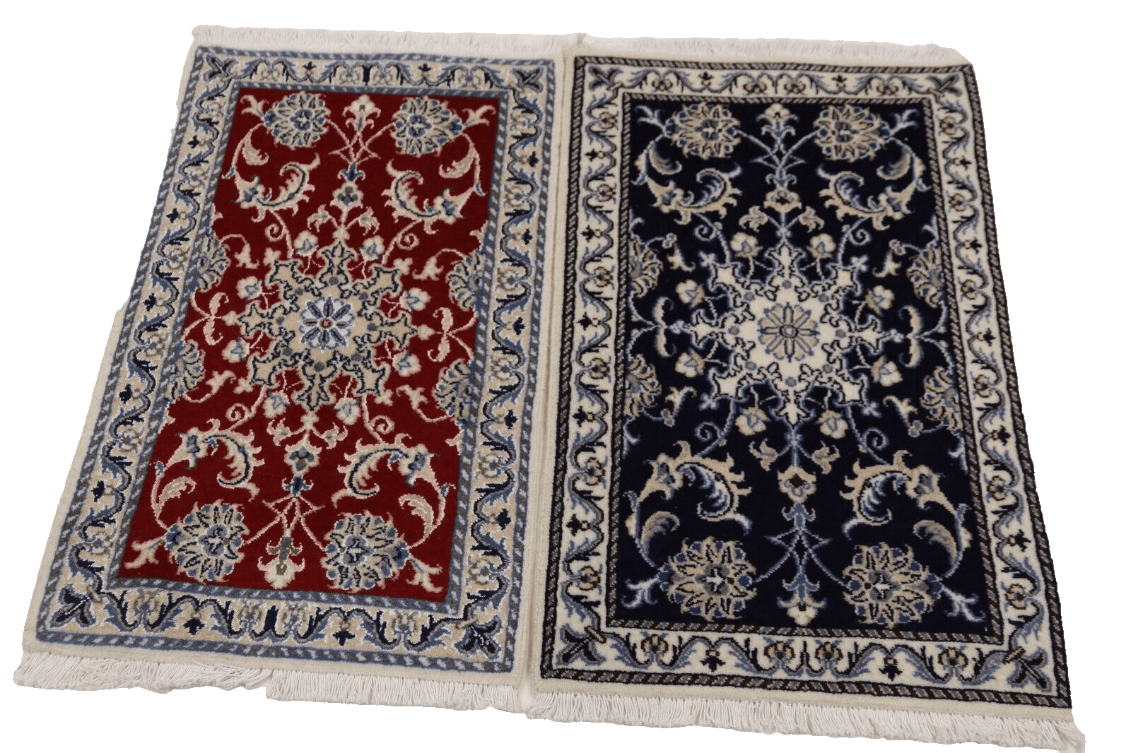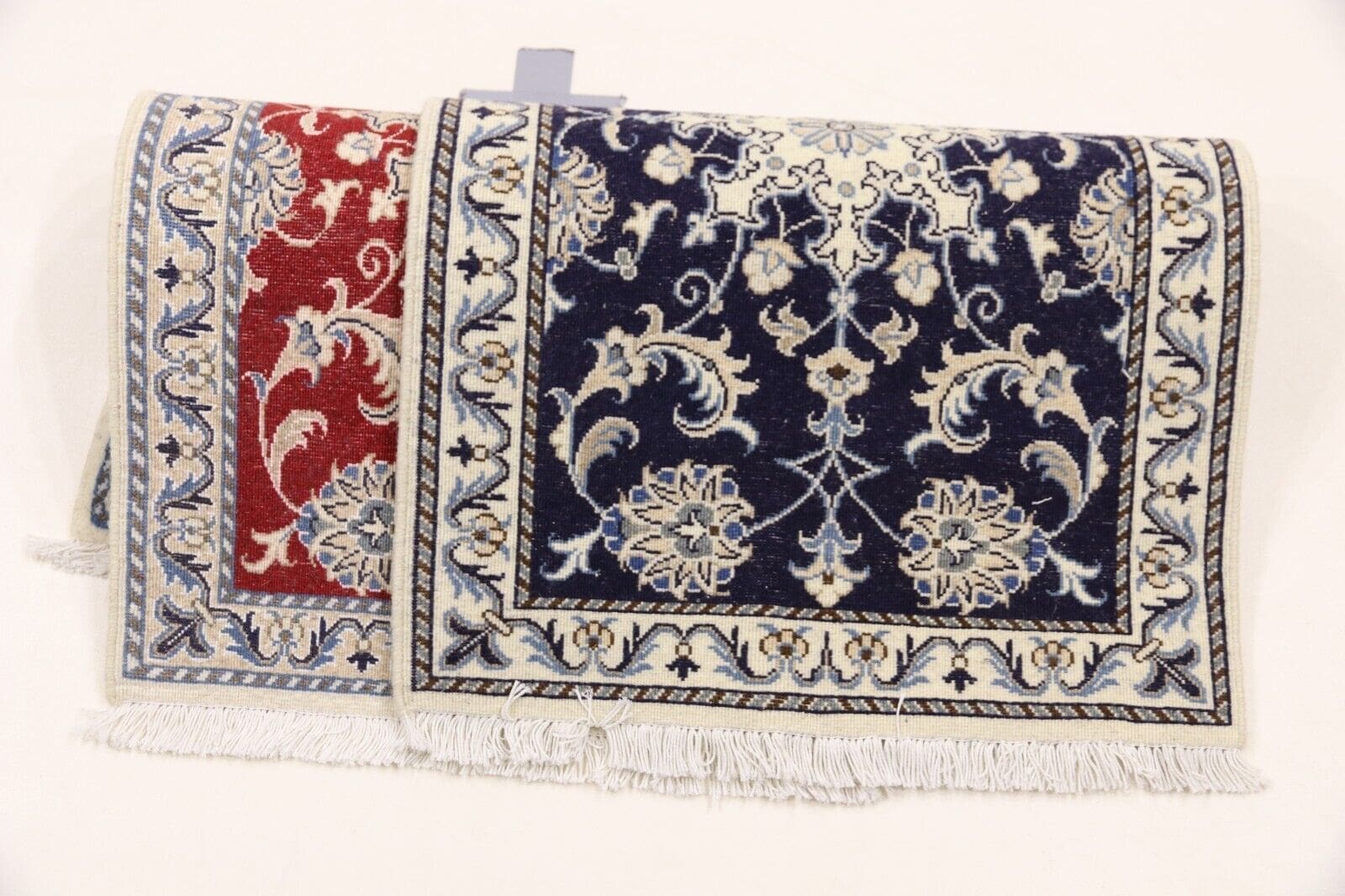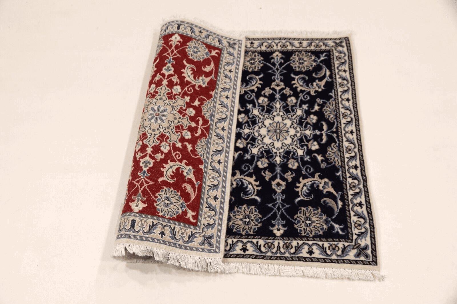 Handgeknüpfter Orientteppich | Größe: 90 x 60 cm | Knotendichte: ca. 300.000 Knoten/m² | Material: 90% Schurwolle, 10% Seide | Zustand: Neu, perfekt | Herkunft: Persien | Farbe: Rot und Dunkelblau | Dicke: ca. 8 mm | Für Fußbodenheizung geeignet | Haustierfreundlich