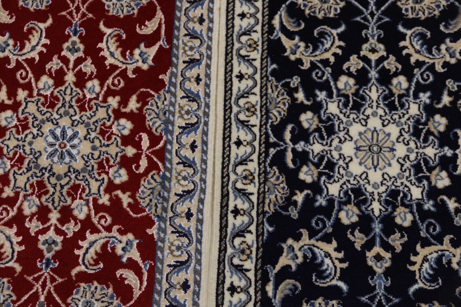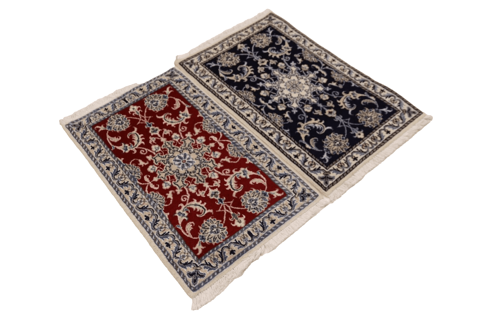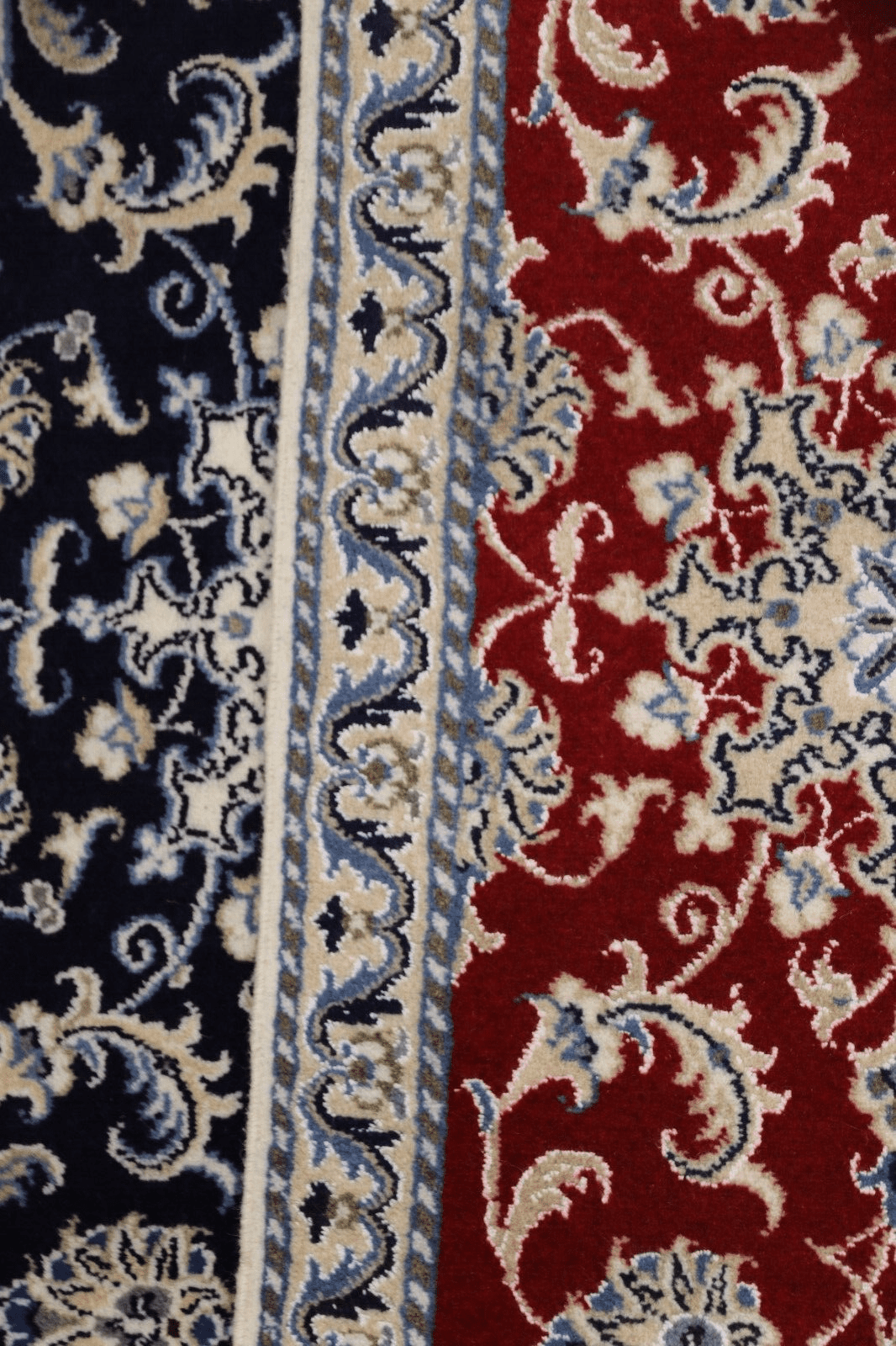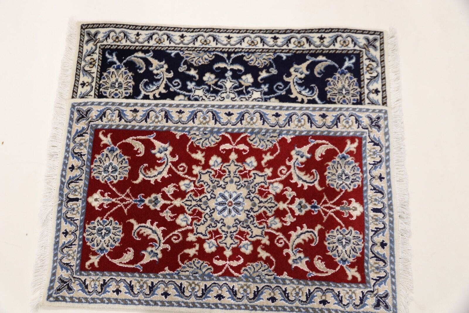 Handgeknüpfter Orientteppich | Größe: 90 x 60 cm | Knotendichte: ca. 300.000 Knoten/m² | Material: 90% Schurwolle, 10% Seide | Zustand: Neu, perfekt | Herkunft: Persien | Farbe: Rot und Dunkelblau | Dicke: ca. 8 mm | Für Fußbodenheizung geeignet | Haustierfreundlich