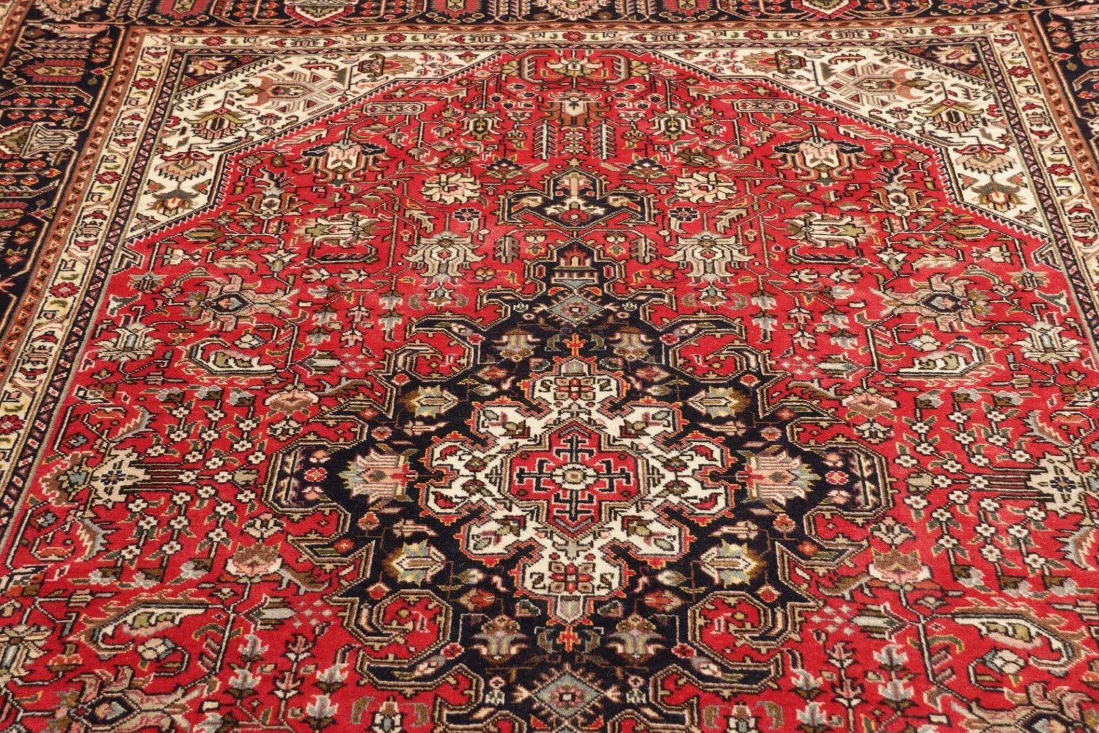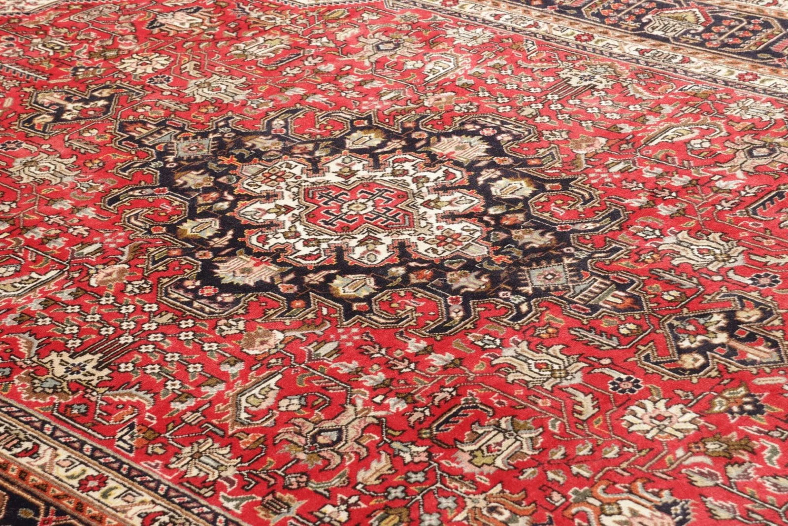 Der Teppich stammt aus der Stadt Täbriz, die im Nordwesten Irans liegt und als eine der ältesten und bedeutendsten Zentren für Teppichkunst gilt. Die Tradition der Teppichknüpferei in Täbriz reicht bis ins 15. Jahrhundert zurück, und die Stadt war ein wichtiger Handelsplatz entlang der Seidenstraße. Teppiche aus Täbriz sind bekannt für ihre feine Verarbeitung, hohe Knotenzahl und die Nutzung hochwertigster Materialien.