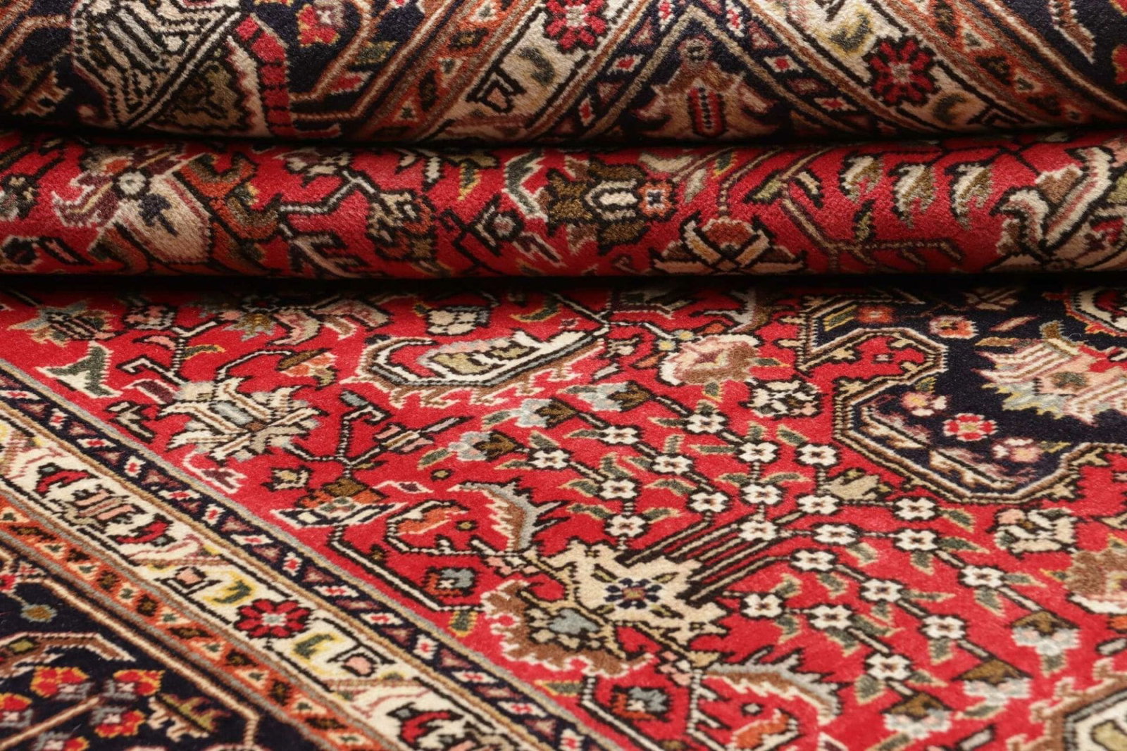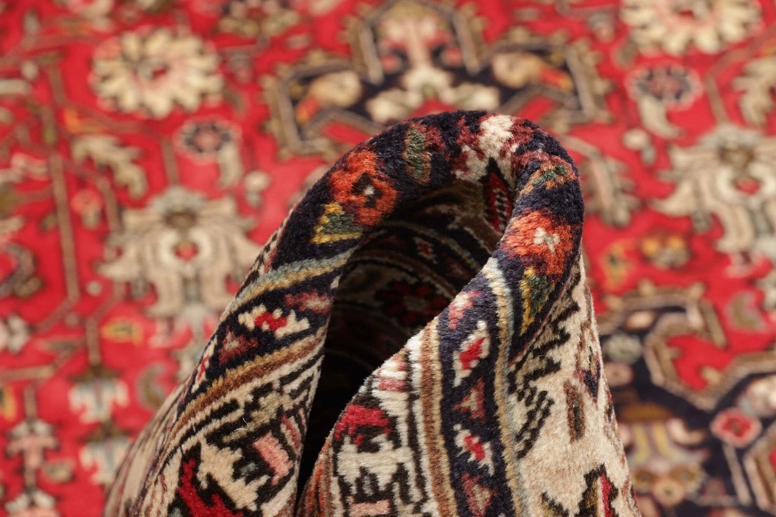 Der Teppich ist aus reiner Schurwolle gefertigt, einem Material, das für seine Robustheit und Weichheit bekannt ist. Schurwolle besitzt die Fähigkeit, Wärme zu speichern und gleichzeitig die Umgebungstemperatur zu regulieren, was den Teppich nicht nur zu einem dekorativen Element, sondern auch zu einem funktionalen Möbelstück macht. Die handgeknüpfte Technik gewährleistet, dass jedes Stück in mühevoller Arbeit gefertigt wurde, wodurch der Teppich ein Unikat darstellt. Diese Art der Verarbeitung sorgt für eine hohe Knotendichte, die typischerweise bei Teppichen aus Täbriz zu finden ist und die Haltbarkeit maßgeblich erhöht.
