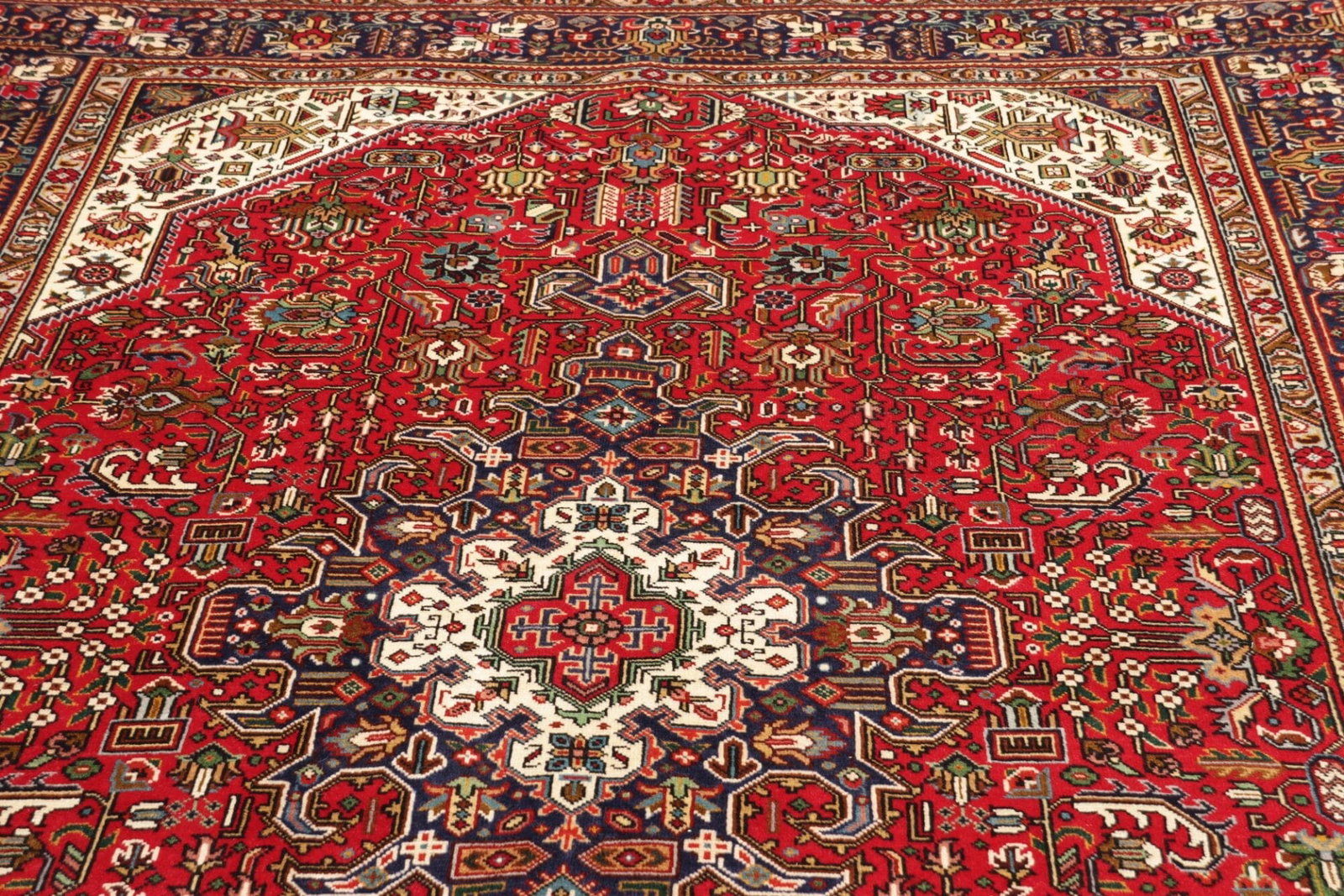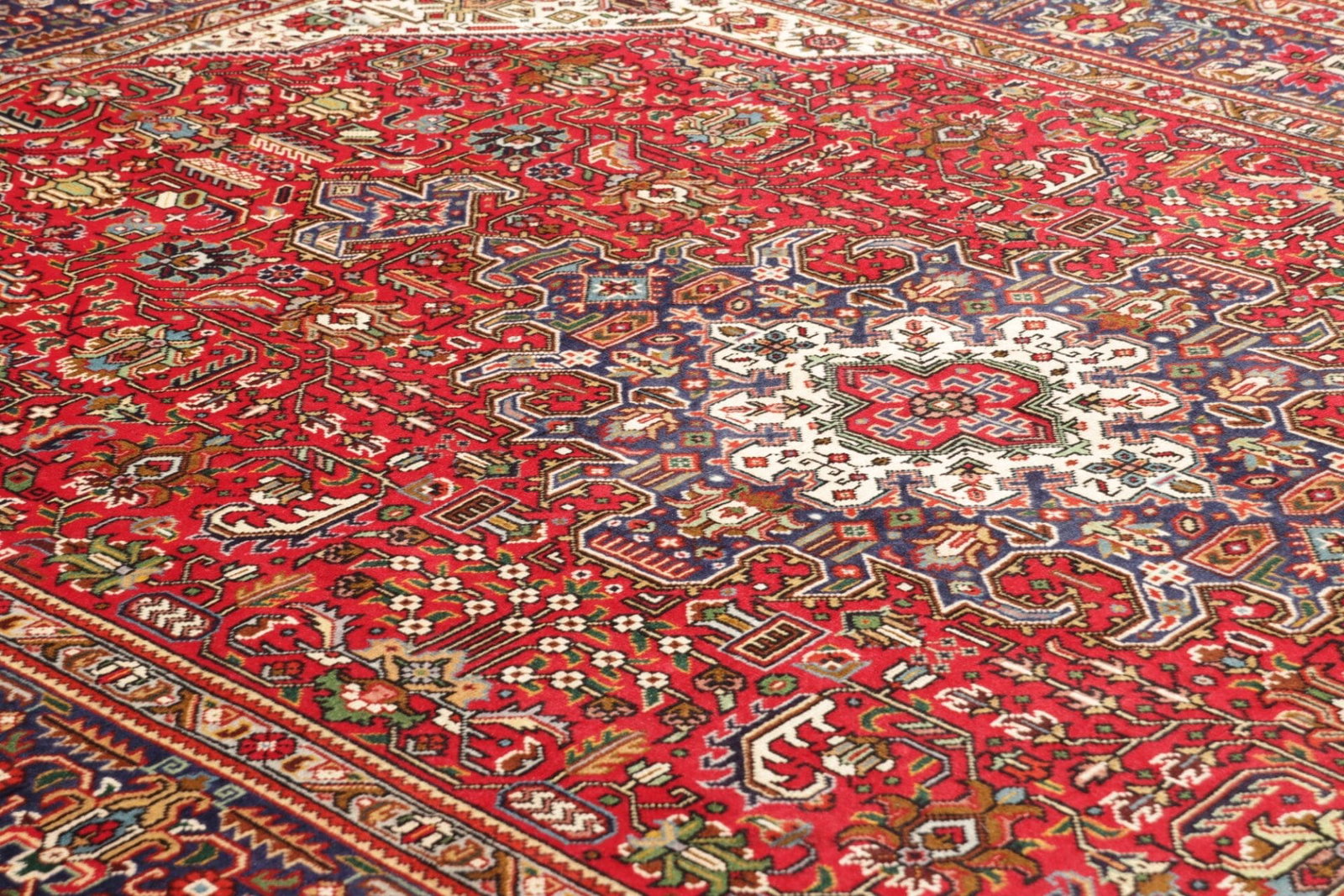 Der Teppich stammt aus der Stadt Täbriz im Iran, die als eine der führenden Teppichproduktionsstätten bekannt ist. Täbriz ist berühmt für seine reichen Teppichtraditionen, die bis ins 15. Jahrhundert zurückreichen. Die Teppiche dieser Region zeichnen sich durch ihre hohe Knotendichte aus, die meist zwischen 300 und 1.000 Knoten pro Quadratmeter liegt. Diese hohe Dichte ermöglicht es, feine und detaillierte Muster zu weben, die oft komplexe florale und geometrische Designs abbilden.