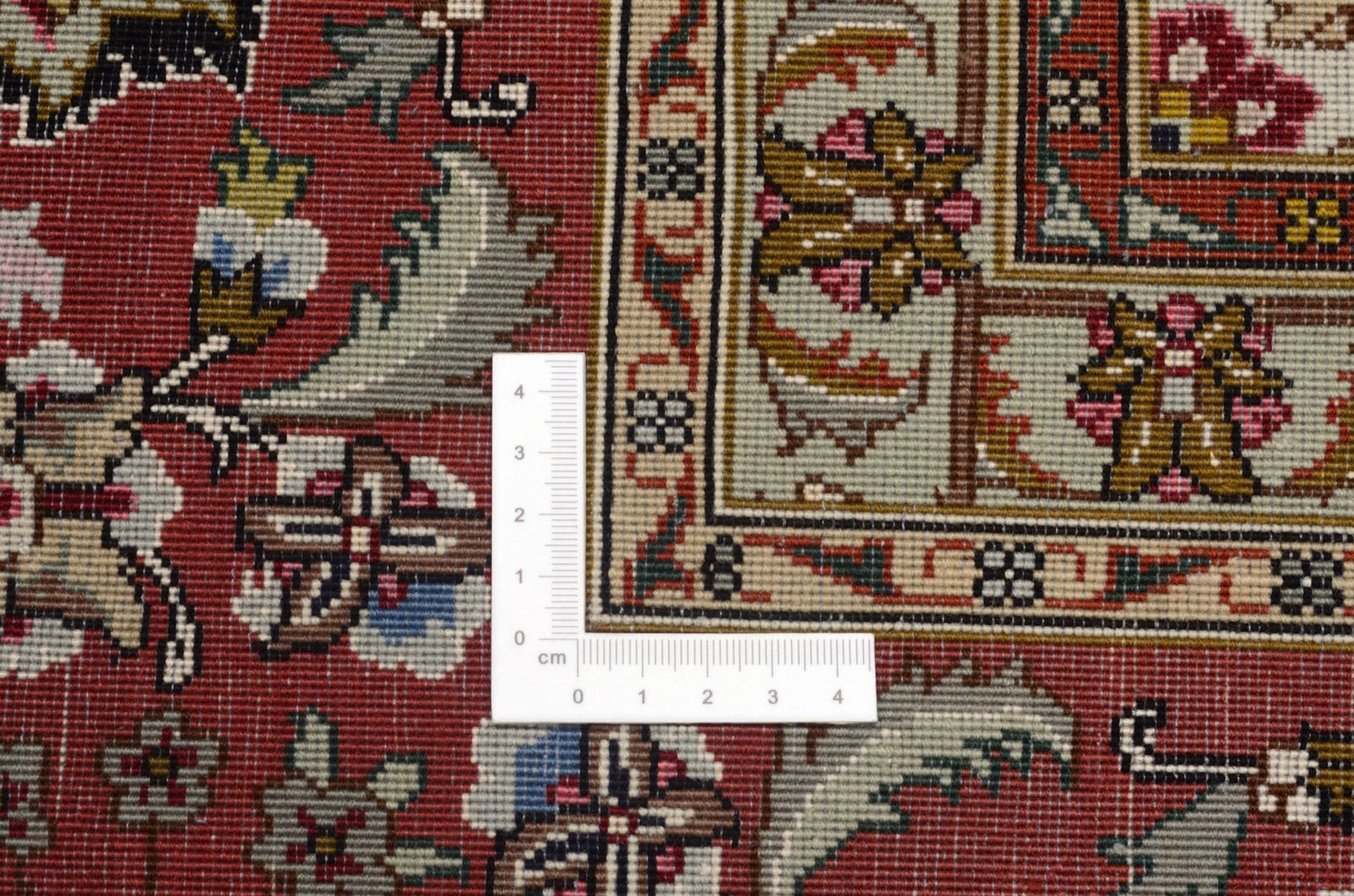 Das Zusammenspiel der Farben ist ein weiteres Markenzeichen der Täbriz Teppiche. Die handgeknüpfte Verarbeitung ermöglicht eine Vielzahl an Farbschattierungen, die dem Teppich ein lebendiges und dynamisches Erscheinungsbild verleihen. Dieser Teppich ist nicht nur ein zeitloses Möbelstück; er verwandelt jeden Raum und bringt Wärme und Stil in Ihr Zuhause.