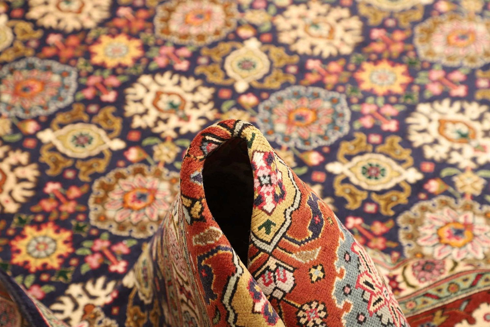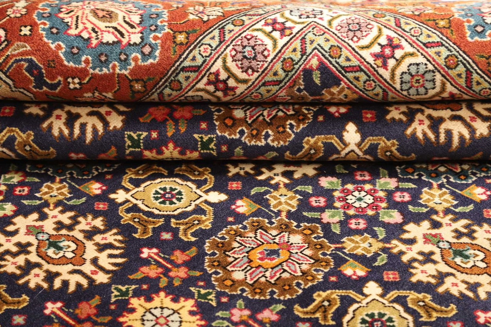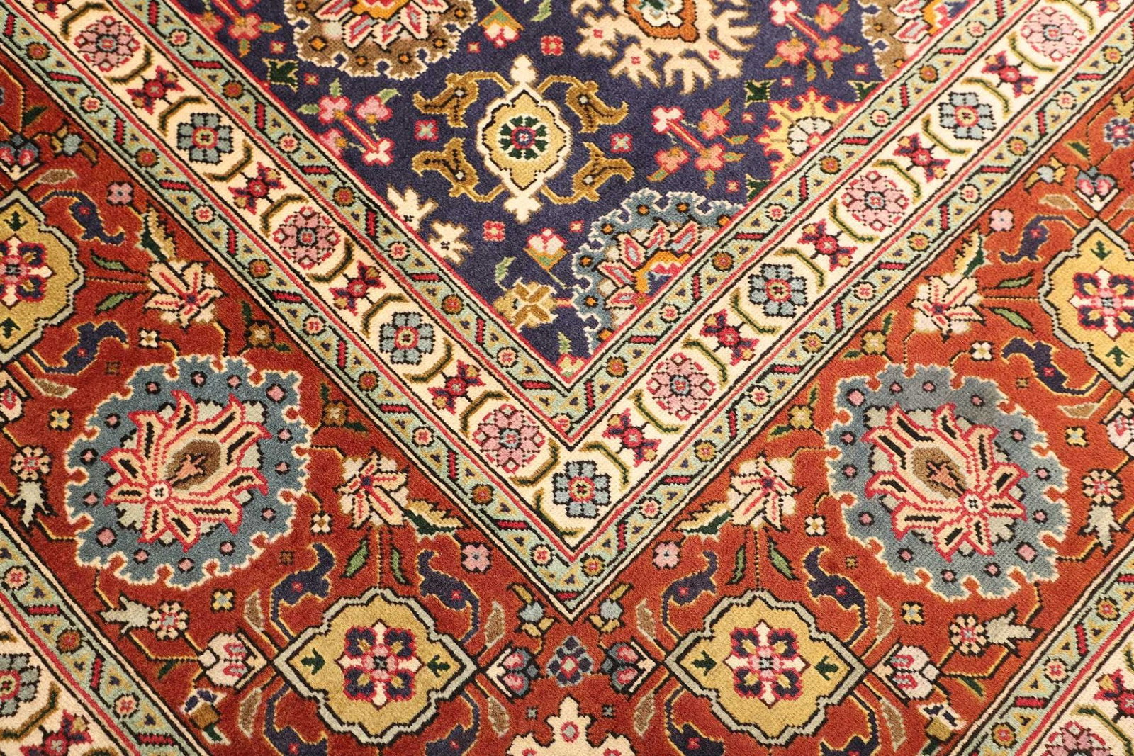 Der Teppich ist aus reiner Schurwolle gefertigt, einem Material, das für seine Langlebigkeit und Weichheit bekannt ist. Schurwolle hat hervorragende Eigenschaften: Sie ist strapazierfähig, schmutzabweisend und wärmeisolierend. Zudem sorgt sie für eine angenehme Haptik und behält ihre Form über Jahre hinweg. Die Knotendichte des Teppichs ist bemerkenswert, was ihn besonders robust macht und gleichzeitig die detailreiche Gestaltung der Muster gewährleistet. Jeder Knotensatz wurde von erfahrenen Handwerkern geschaffen, die diese Kunstform von Generation zu Generation weitergegeben haben.